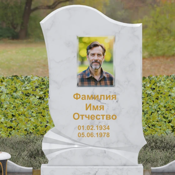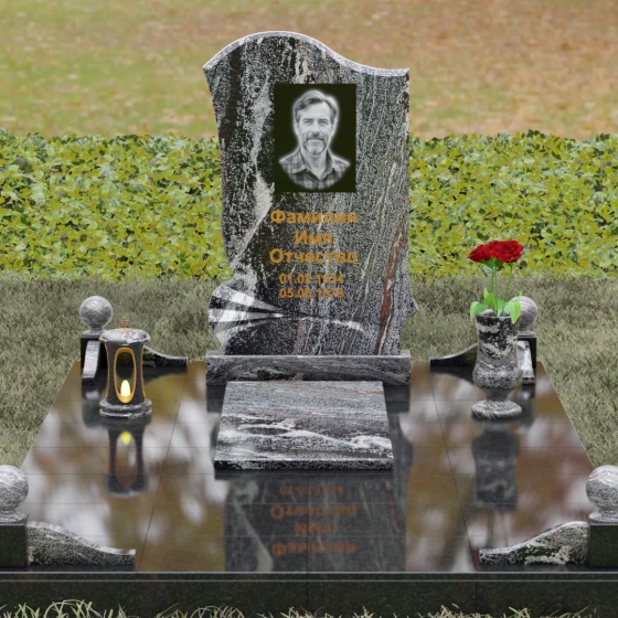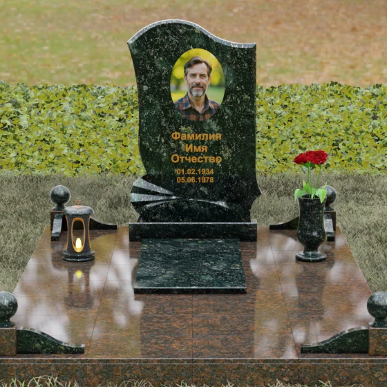 На центральной вертикальной поверхности идеально располагается крупный портрет, выполненный методом художественной гравировки или на фотокерамике. Пространство позволяет разместить памятные надписи, эпитафии и даты жизни, используя глубокую вырубку с покрытием сусальным золотом, что создает эффект свечения. Гармонию мемориального ансамбля дополняют функциональные элементы декора: изящная гранитная ваза, предназначенная для возложения живых цветов, и закрытая каменная лампада. Фонарь лампады защищает огонь свечи от ветра, символизируя вечную память, которая не гаснет. Каждый элемент этого благоустройства продуман до мелочей, чтобы создать достойный образ памяти о дорогом человеке.