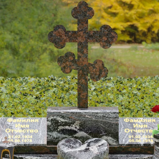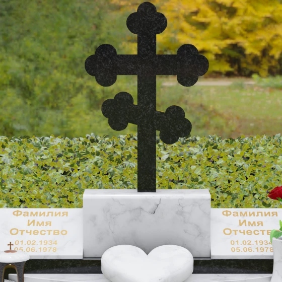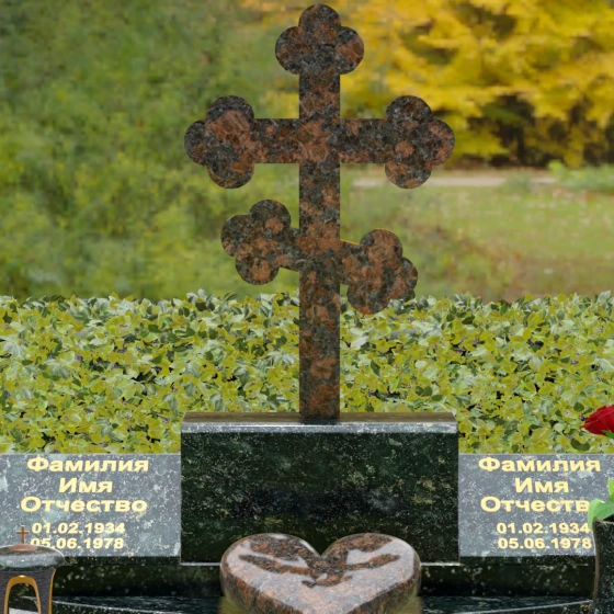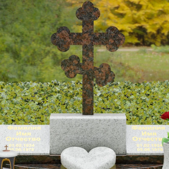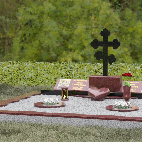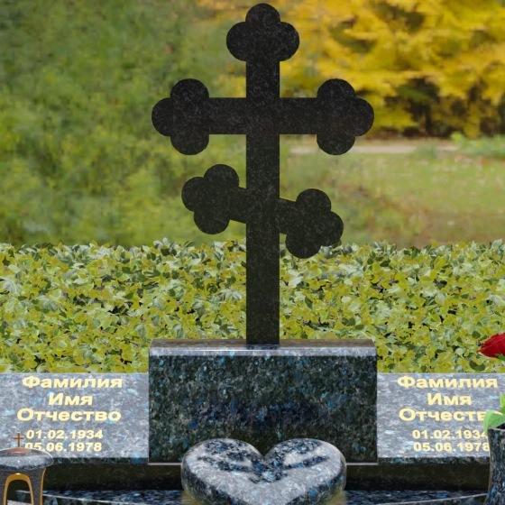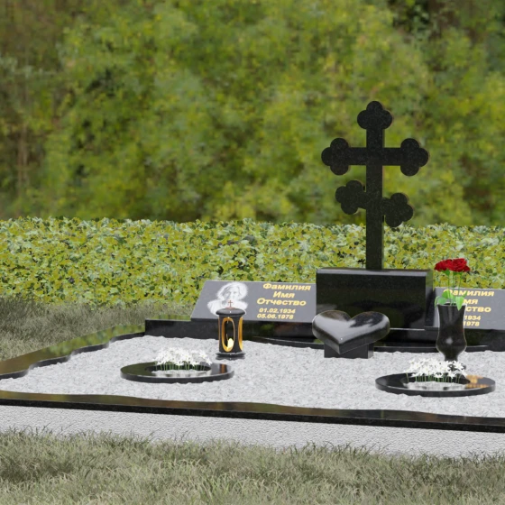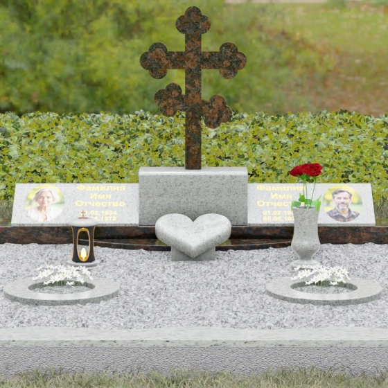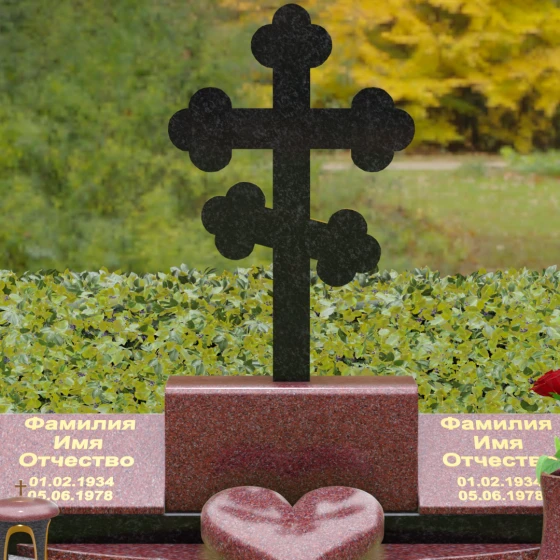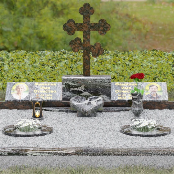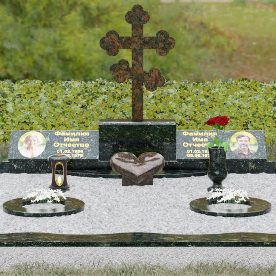 Представленная мемориальная композиция — это монументальный художественный ансамбль, воплощающий идею вечного единения и нерушимой памяти. Центром архитектурного решения выступает величественный православный крест с фигурными навершиями в форме трилистника, установленный на массивный постамент. Перед ним расположено объемное каменное сердце — символ глубокой привязанности и любви, которая переживает века. По обе стороны от центральной оси симметрично размещены две горизонтальные стелы с плавными, волнообразными верхними гранями. Каждая деталь здесь пропитана благородством: зеркальная полировка лицевых поверхностей создает глубокие отражения, контрастируя с матовой фактурой боковых срезов, что придает изделию визуальный объем и торжественность.