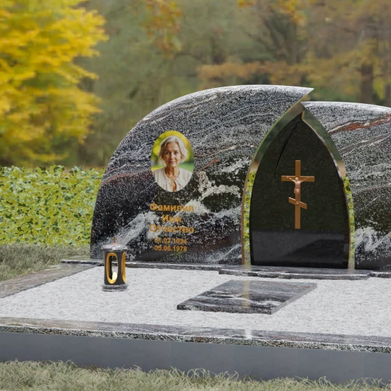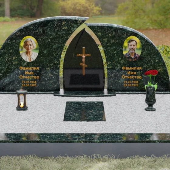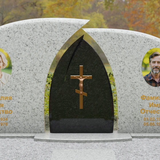 Оформление: Форма стелы идеально подходит для парных захоронений. Благодаря большой полезной площади полированных плит, портреты можно расположить симметрично, используя как классическую гравировку, так и цветную фотокерамику. Золоченая гравировка ФИО будет особенно эффектно смотреться на темном фоне, перекликаясь с цветом центрального креста и создавая цельный, дорогой образ.