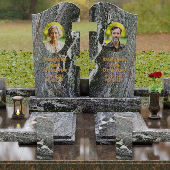 Представленный гранитный монумент — это глубокое художественное высказывание о неразрывной связи двух душ. Композиция состоит из двух вертикальных обелисков, внутренние грани которых выполнены в виде сложного, идеально подогнанного «пазла». Этот резной замок символизирует единство, верность и общую судьбу. Форма верхней части каждого элемента напоминает мягкую, благородную волну, которая уравновешивает строгую геометрию внешних углов. Особое внимание мастер уделил обработке торцов: каждая грань доведена до совершенства, создавая четкий силуэт, который гармонично смотрится на фоне любого ландшафта. Центром композиции является игра света на безупречной поверхности — зеркальная полировка камня достигает такой глубины, что в ней отражается небо, создавая иллюзию живого дыхания внутри застывшей материи.