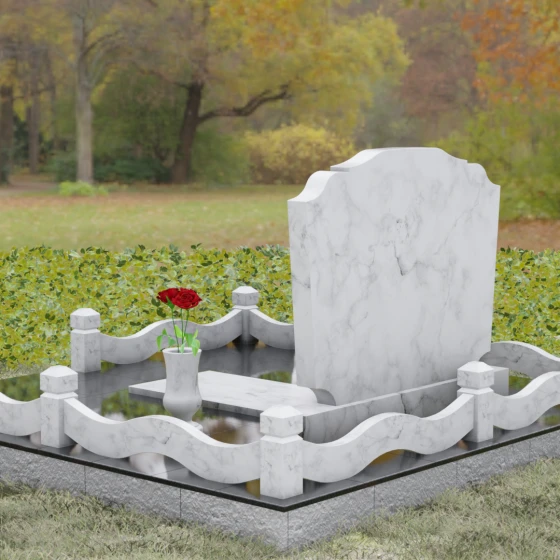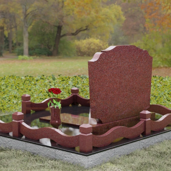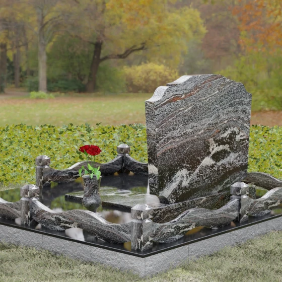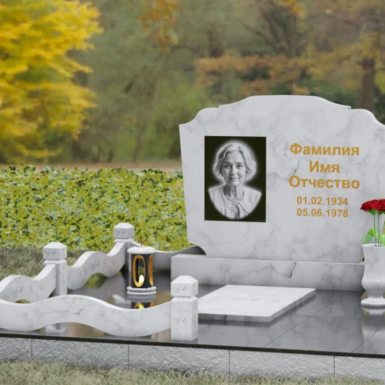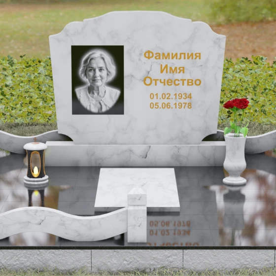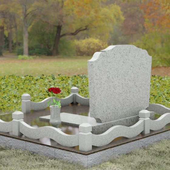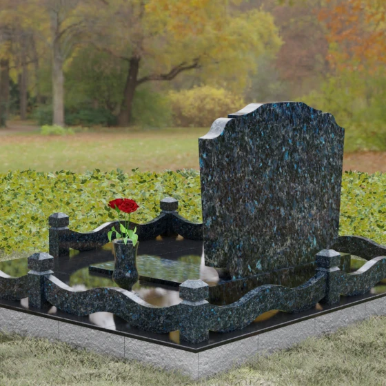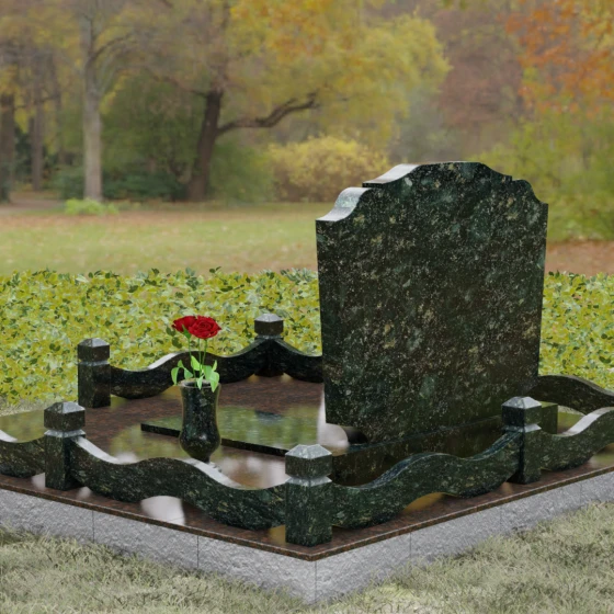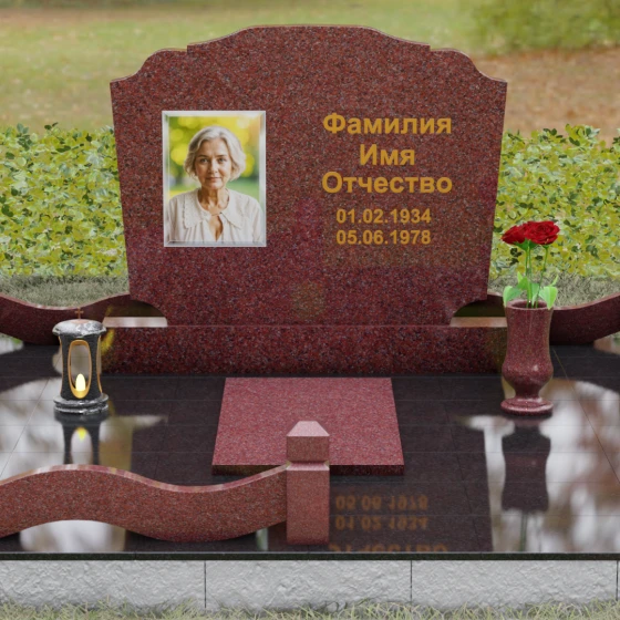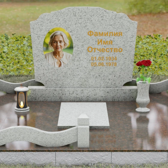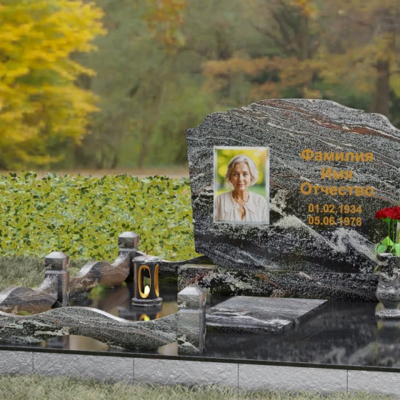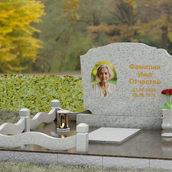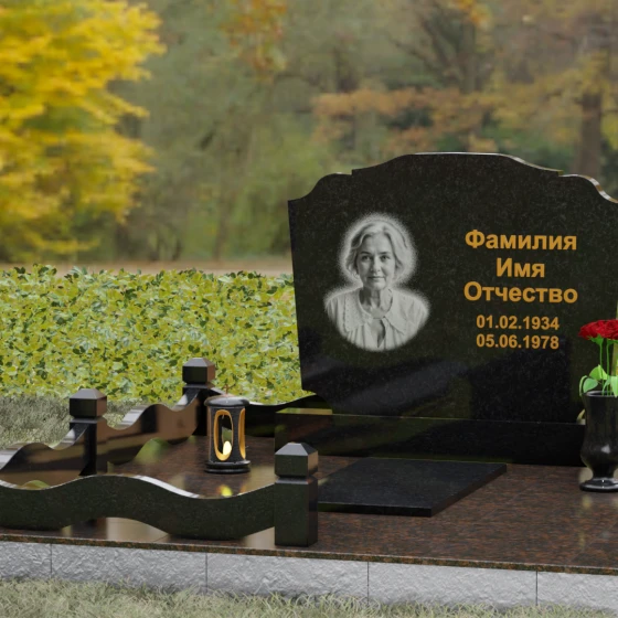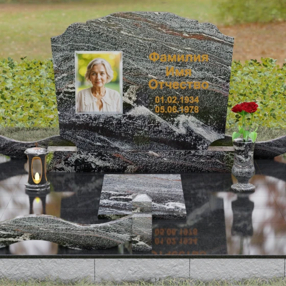 Представленная мемориальная композиция — это воплощение эстетики покоя и возвышенной печали, застывшей в камне. В отличие от стандартных вертикальных стел, данная модель ориентирована горизонтально, что придает всему ритуальному ансамблю ощущение устойчивости, монументальности и защищенности. Главной художественной особенностью является сложная геометрия граней: верхняя и нижняя кромки основной плиты выполнены в виде мягких, симметричных волн. Эти плавные изгибы лишают холодный камень резкости, символизируя завершенность жизненного пути и тишину вечного сна.