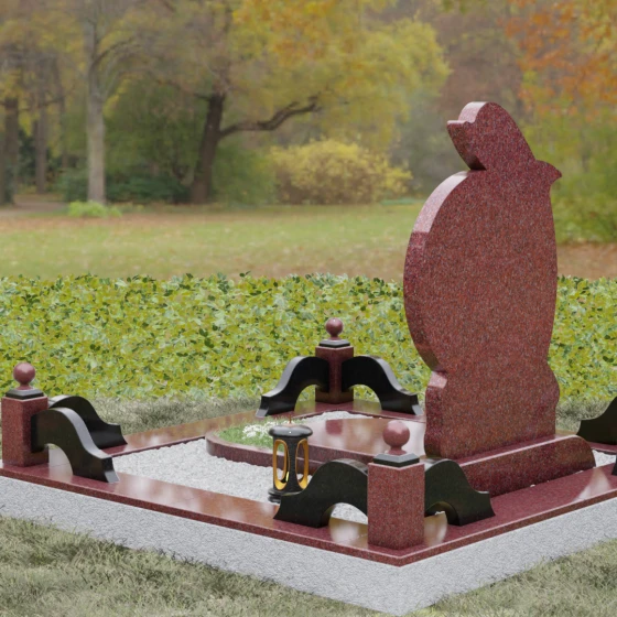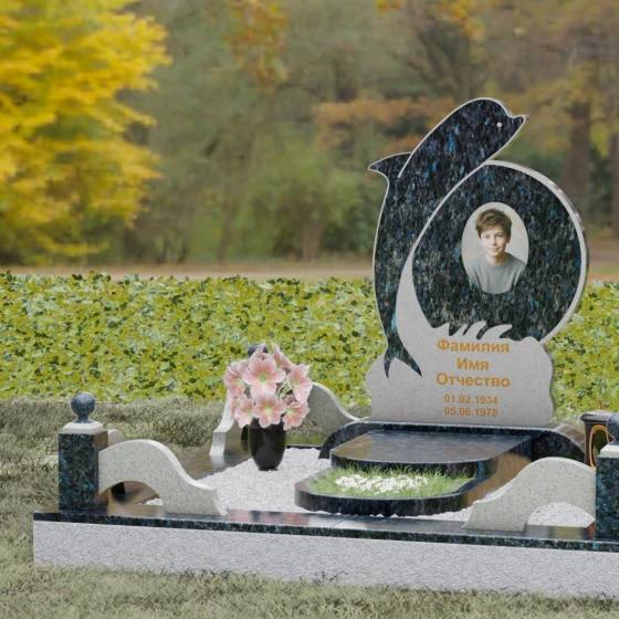 Этот гранитный монумент представляет собой не просто мемориальный знак, а настоящую художественную композицию, преисполненную глубокого символизма. Центральное место в дизайне занимает фигура дельфина — древнего символа спасения, чистоты и проводника душ в лучший мир. Плавный, динамичный изгиб морского обитателя словно обнимает центральный медальон, создавая защищенное, камерное пространство для портрета близкого человека. Мастера добились удивительной игры контрастов: зеркально отполированное туловище дельфина эффектно выделяется на фоне матовой, детально проработанной резьбы в основании, имитирующей морскую пену и гребни волн.