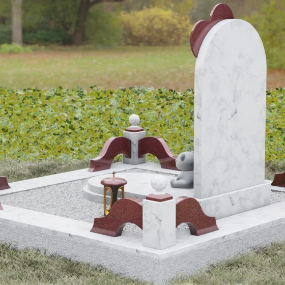 • Символические аксессуары: У подножия стелы расположена скульптура маленького медвежонка, выполненная из светлого камня с матовой фактурой, что подчеркивает невинность и чистоту души.