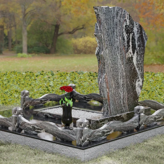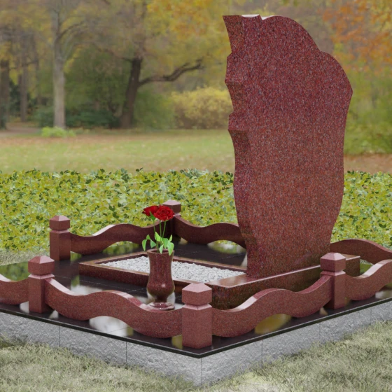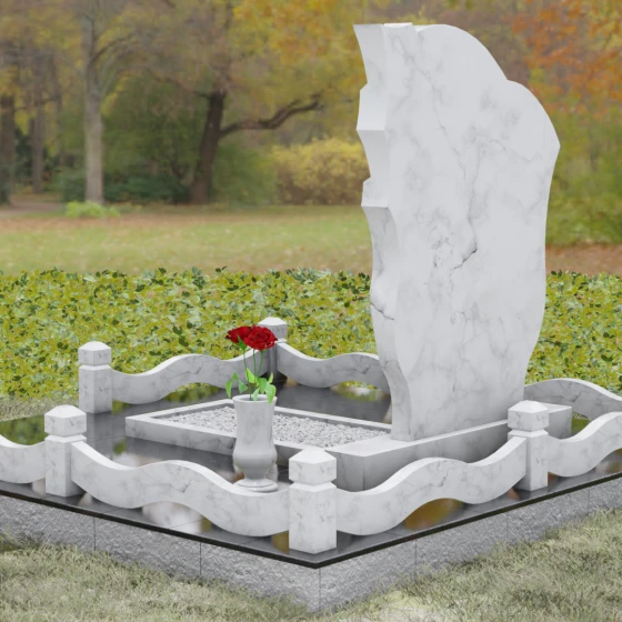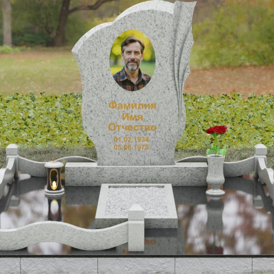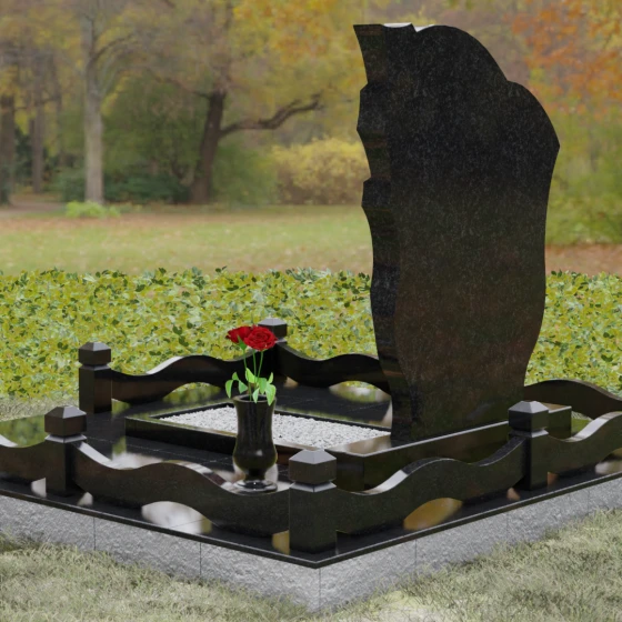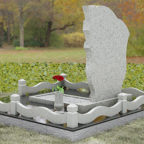 Форма этого надгробия наполнена глубокими сакральными смыслами. Драпировка с правой стороны — это древний символ скорби и защиты, олицетворяющий завесу между земным миром и вечностью. Плавный волнообразный контур символизирует течение жизни, её непрерывность и духовное преображение. Отсутствие острых, агрессивных углов настраивает на волну умиротворения и покоя, превращая место захоронения в пространство для светлых воспоминаний и тихой беседы с душой ушедшего. Это воплощение защиты, вечного приюта и нерушимой связи поколений.