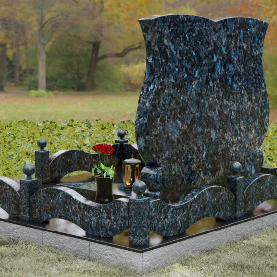 Данная модель не ограничивается одной лишь стелой — это законченное архитектурное решение. Памятник установлен на массивный гранитный цоколь, обеспечивающий идеальную горизонталь и устойчивость всей конструкции. Вместо открытого цветника здесь используется сплошная надгробная плита, что не только придает участку эстетическую завершенность, но и является практичным решением для сохранения чистоты. Периметр захоронения оформлен декоративным каменным бордюром с фигурными столбиками, на которых установлены идеально отполированные шары. В композицию гармонично интегрированы парные вазы из того же вида камня и центральная лампада, создавая единое сакральное пространство.