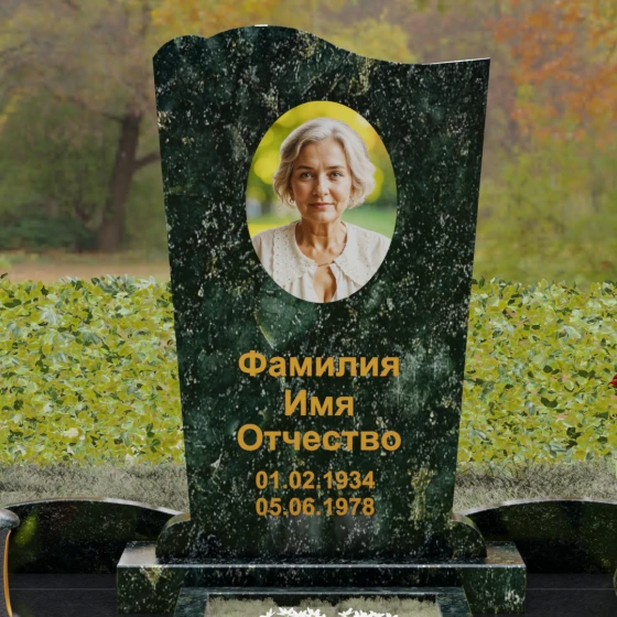 Стела этого ансамбля (Артикул 150) отличается изысканной асимметричной геометрией, которая выделяет её на фоне классических решений. Верхняя грань изделия выполнена в форме плавной, ниспадающей волны, напоминающей движение ткани или изгиб небесного свода. Этот мягкий рез по камню создает выразительный силуэт, который гармонирует с вертикальными боковыми гранями, слегка сужающимися к основанию. Особое внимание уделено фактуре: идеально гладкая зеркальная полировка лицевой поверхности контрастирует с четкими, мастерски обработанными фасками. Игра света на полированных гранях подчеркивает благородство природного материала, а глубина блеска создает эффект бесконечности, в которой отражается небо, соединяя земную память с вечностью.