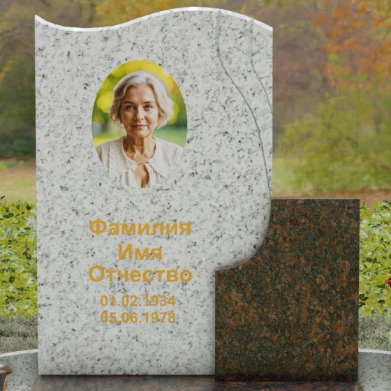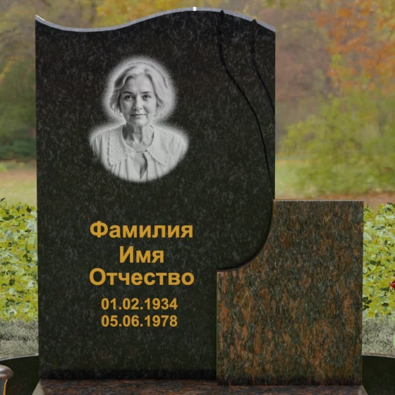 Конструкция является комбинированной, что открывает широкие возможности для индивидуализации. Основной вертикальный блок гармонично дополнен вторым, более приземистым прямоугольным элементом из камня другого оттенка. Такое сочетание фактур и цветов позволяет создать уникальный художественный образ. Портрет, нанесенный в изящной овальной технике или методом лазерной гравировки, дополняется золоченой каллиграфией, которая выглядит особенно благородно на темном фоне полированного гранита.