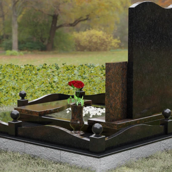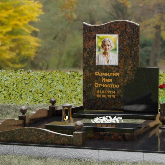 Мемориальный ансамбль включает в себя не только стелу, но и продуманную систему благоустройства участка, что придает захоронению законченный и торжественный вид. Основание покоится на прочном гранитном цоколе, который обеспечивает устойчивость всей конструкции на десятилетия. Вместо открытого грунта по всей площади участка уложена монолитная надгробная плита, что не только подчеркивает монументальность комплекса, но и несет практическую функцию, защищая место памяти от прорастания травы. Периметр оформлен изящным каменным бордюром со столбиками, каждый из которых увенчан идеально отполированным декоративным шаром — символом завершенности и вечности. Композицию завершает массивная гранитная ваза, выполненная в единой стилистике с памятником.