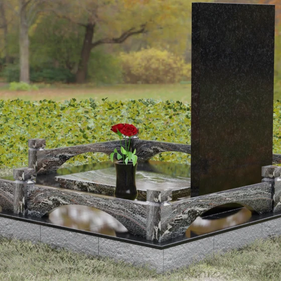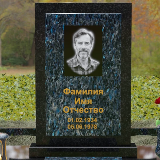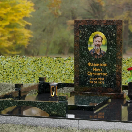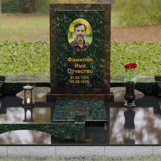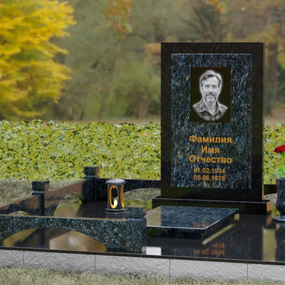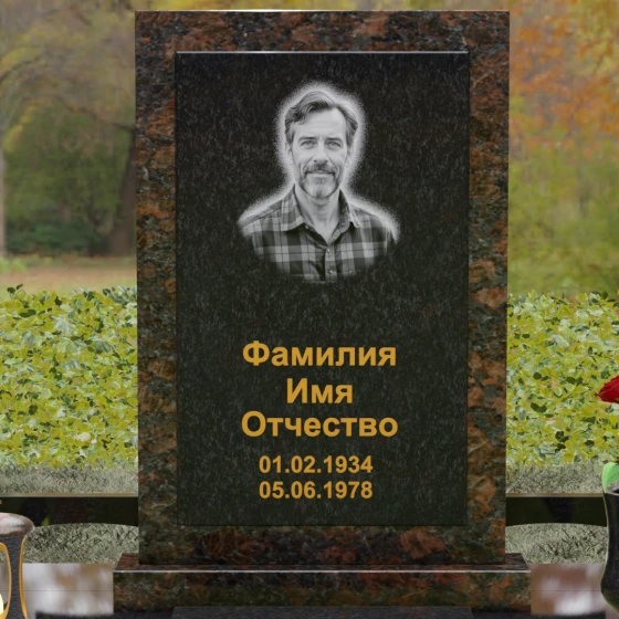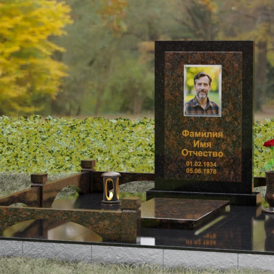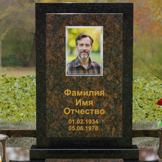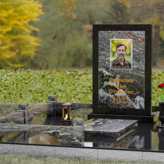 Центральным элементом ансамбля является величественная вертикальная стела, выполненная по принципу "камня в камне". Внешний массивный контур, напоминающий классический портал или торжественную раму, надежно удерживает внутреннюю плиту, создавая эффект глубины и защищенности. Геометрия изделия строга и лаконична: прямые углы и четкие фаски подчеркивают мужественность и твердость характера, в то время как безупречная зеркальная полировка лицевых поверхностей играет на контрасте с природным рисунком камня. Многоуровневость конструкции придает обелиску объем, делая его доминантой всего захоронения.