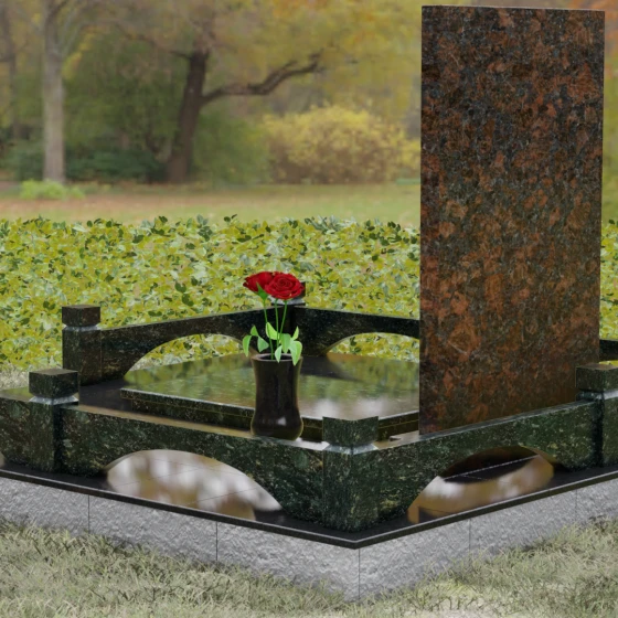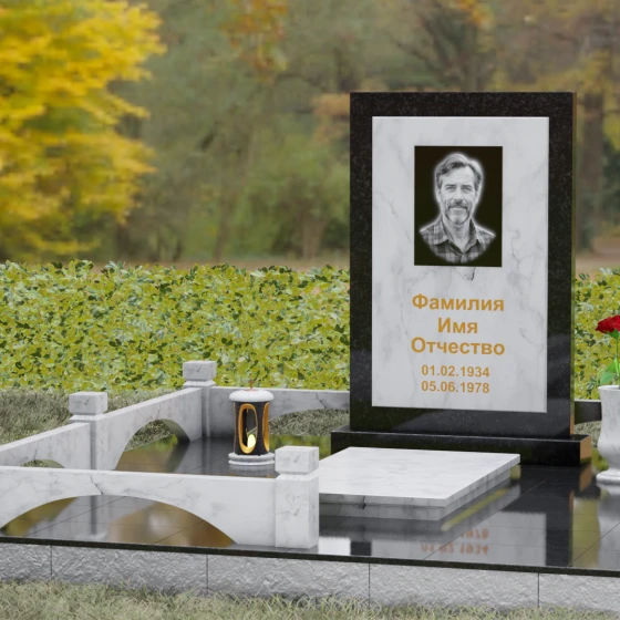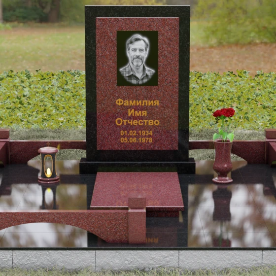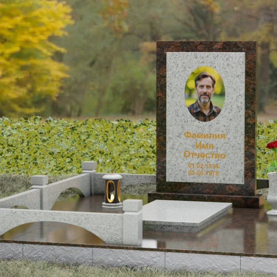 Особое внимание уделено благоустройству прилегающей территории. Основание надгробия покоится на массивном гранитном подиуме, который переходит в закрытую систему мощения. Использование сплошных плит вместо открытого грунта не только придает участку эстетическую завершенность, но и гарантирует идеальный порядок на долгие годы. Периметр обозначен строгим каменным цоколем с акцентными столбиками, создающими ощущение приватности и сакральности пространства. Композицию дополняют функциональные элементы декора: изящная каменная ваза для живых цветов и закрытая лампада, в которой огонь памяти будет защищен от любых капризов стихии.