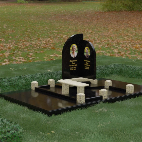 Данная модель представляет собой завершенное решение «под ключ», где продумана каждая деталь оформления территории. Участок полностью облицован массивными гранитными плитами, что не только создает эстетически безупречный вид, но и является максимально практичным решением: сплошное мощение исключает прорастание травы и упрощает уход. По периметру установлен низкий, но массивный цоколь, дополненный декоративными каменными столбиками (балясинами) квадратного сечения. Эти элементы очерчивают границы сакрального пространства, придавая ему архитектурную целостность. Входящая в комплект гранитная скамья на прочных опорах выполнена в едином стиле с основным монументом, приглашая к тихим минутам памяти в комфортной обстановке.