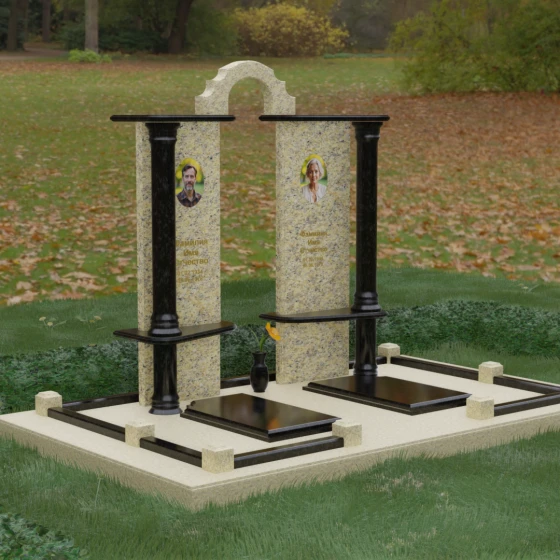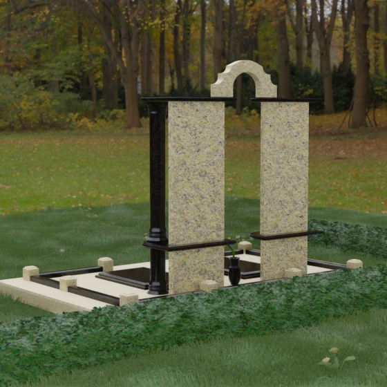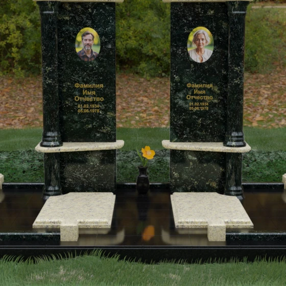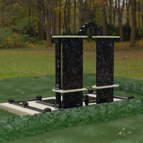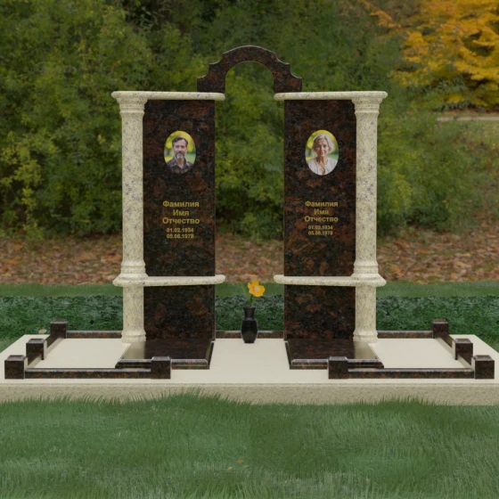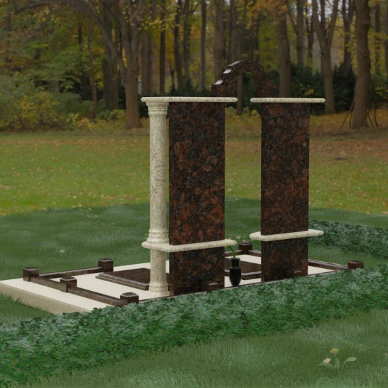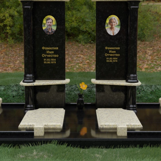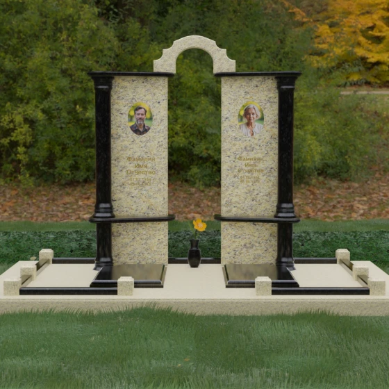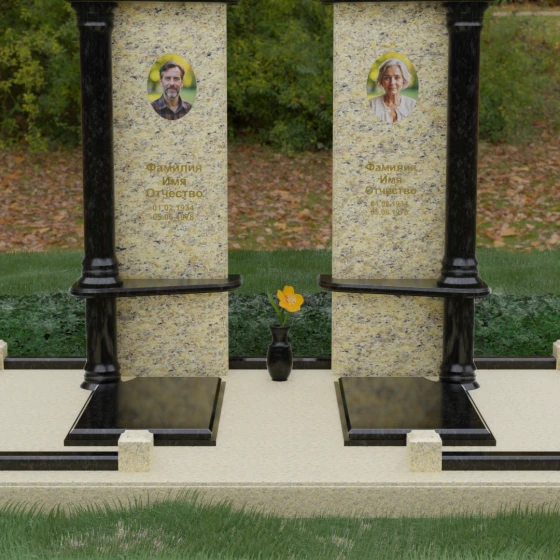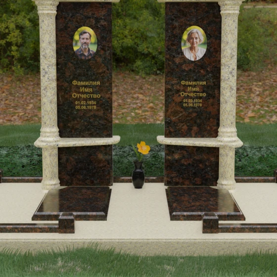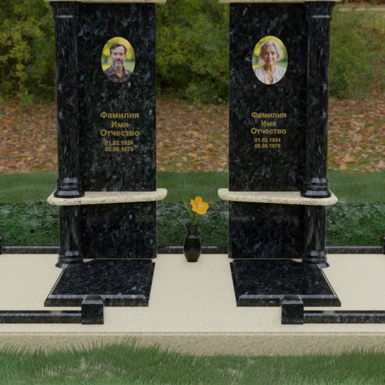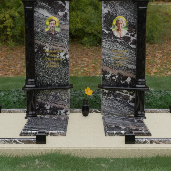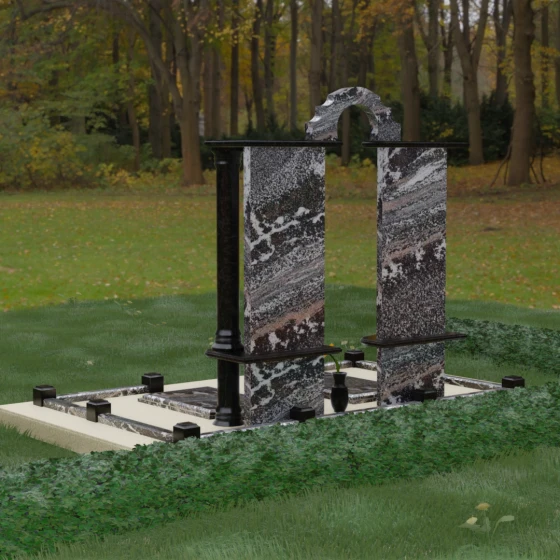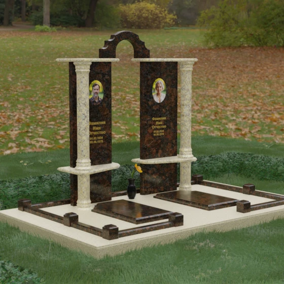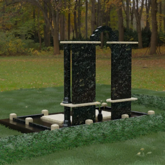 Данный мемориальный ансамбль представляет собой глубокое философское размышление, воплощенное в камне. Это ритуальное изделие притягивает взгляд своей безупречной симметрией и архитектурной сложностью, которая выходит за рамки привычных представлений о надгробиях. Выбор этой модели продиктован стремлением подчеркнуть неразрывную связь двух душ. Две вертикальные стелы, словно две страницы одной летописи, обрамлены величественными колоннами, которые в искусстве символизируют опору, триумф духа и надежный фундамент прожитой жизни. Особое внимание уделено геометрии: строгие вертикальные линии смягчаются горизонтальными полками-перекрытиями из контрастного камня, создавая визуальный ритм «ступеней», ведущих к вечному покою. Игра света на зеркально отполированных плоскостях в сочетании с фактурными вставками придает композиции объем и торжественность, превращая место памяти в настоящий портал истории.