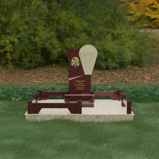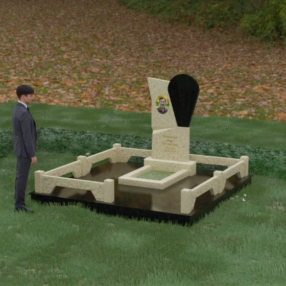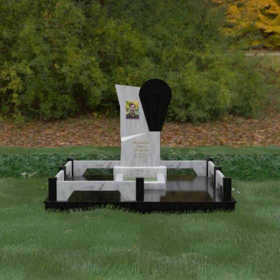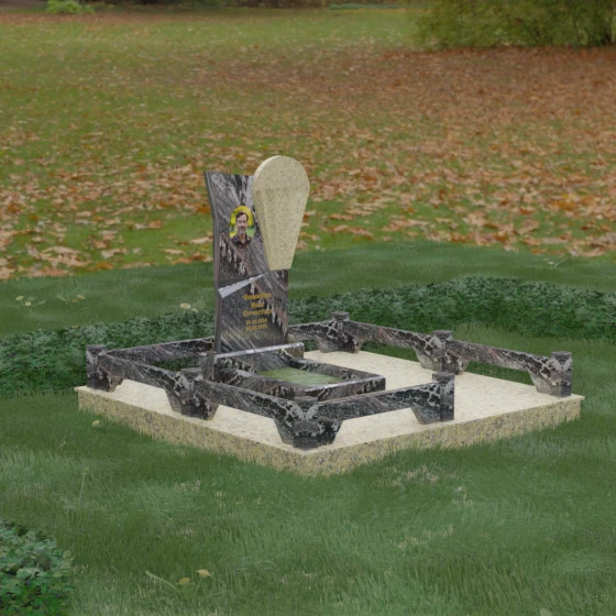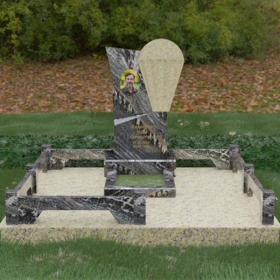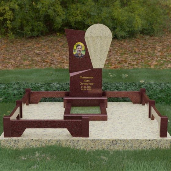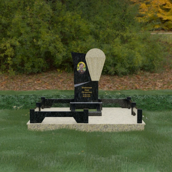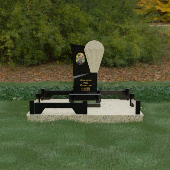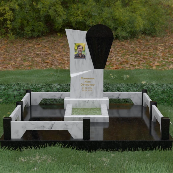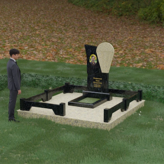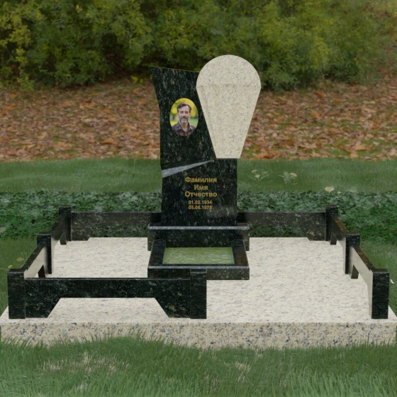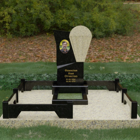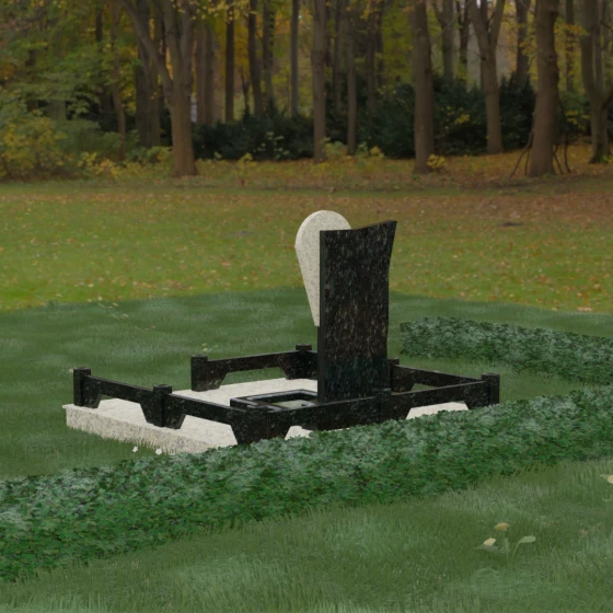 Данное ритуальное изделие представляет собой образец современной мемориальной пластики, где эстетика минимализма встречается с глубоким философским подтекстом. В центре композиции — сложная асимметричная стела, состоящая из двух контрастных элементов. Основная часть, выполненная из темного полированного камня, символизирует земную твердь и непоколебимую память, в то время как изящная светлая вставка в форме капли или воздушной сферы, устремленной вверх, олицетворяет чистоту души и её вечный полет. Игра света на зеркальных плоскостях создает динамичный объем: грани преломляют лучи, заставляя полированную поверхность «оживать» и менять глубину оттенка в зависимости от угла зрения. Этот ансамбль выбирают за его уникальную геометрию, которая выделяется на фоне классических форм, подчеркивая индивидуальность и высокий статус места захоронения.