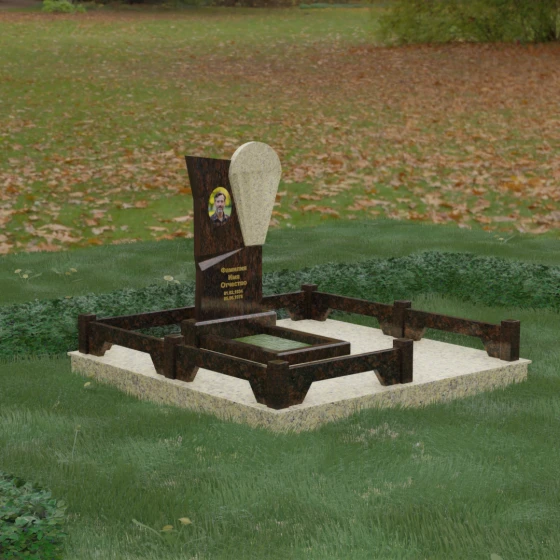 Продуманная конструкция стелы предоставляет широкие возможности для художественного оформления. Круглая ниша в темной части камня идеально подходит для размещения керамического портрета или классической гравировки, создавая эффектную рамку, которая концентрирует внимание на лице. Светлый элемент композиции служит прекрасным фоном для эпитафии, выполненной сусальным золотом или глубокой фрезеровкой — на контрастном камне буквы выглядят четко и торжественно. Особое внимание уделено благоустройству участка: территория полностью облицована плитами из натурального камня, что не только придает объекту завершенный и монументальный вид, но и практически исключает необходимость в сложном уходе, защищая почву от прорастания сорных управ. Периметр обозначен массивным открытым цоколем с акцентными столбиками, которые визуально расширяют границы участка, превращая его в единое, архитектурно выверенное пространство тишины и скорби.