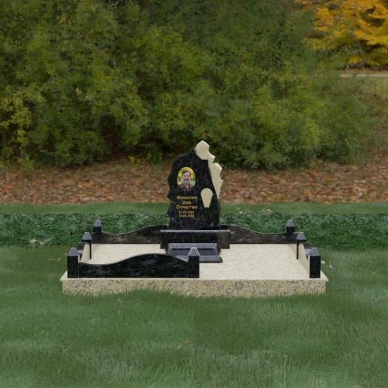 Особого внимания заслуживает художественное решение ограждения. Вместо стандартных прямых линий здесь используются плавные волнообразные изгибы боковых панелей цоколя, которые смягчают общую строгость конструкции. Периметр участка акцентирован массивными квадратными столбиками, увенчанными аккуратными пирамидальными навершиями из контрастного светлого камня. Это создает ритмический архитектурный рисунок, превращая место захоронения в обособленное, защищенное пространство, пропитанное атмосферой покоя и светлой грусти. Плавность линий в сочетании со строгими вертикальными акцентами делает этот мемориал универсальным и эстетически совершенным решением для достойного увековечивания памяти.