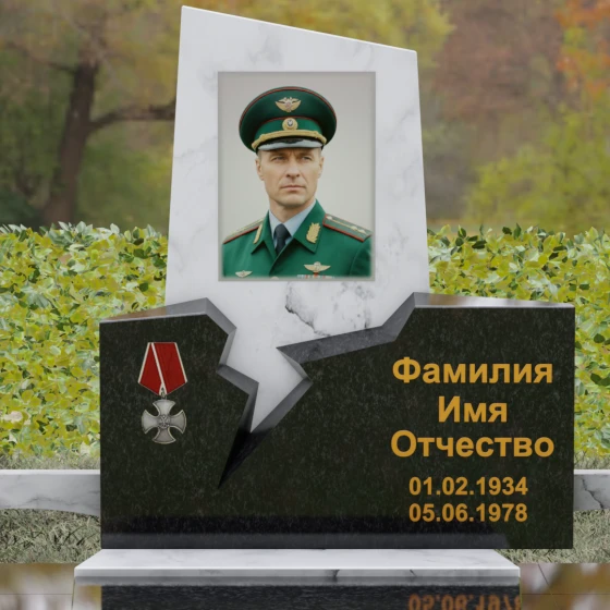 Представленная вашему вниманию величественная стела (Артикул 187) — это не просто мемориальный знак, а глубокое художественное произведение, в котором запечатлена эстетика мужества и непоколебимой воли. Композиция построена на резком, драматичном контрасте двух видов камня и сложных геометрических форм. Верхний сегмент, выполненный из глубокого черного гранита с зеркальной полировкой, устремлен ввысь, символизируя чистоту помыслов и вечный покой. Его асимметричный срез придает монументу динамику и современный вид. Нижняя часть комплекса, созданная из фактурного красно-коричневого гранита, олицетворяет земную твердь и крепость характера. Особого внимания заслуживает художественный разлом — рваная, зигзагообразная линия соприкосновения двух плит. Этот «разлом времени» выглядит максимально натуралистично, создавая визуальное ощущение мощи, способной преодолеть саму смерть. На левой стороне мемориала гордо расположена объемная резьба в виде ордена Мужества с алой лентой, что подчеркивает особый статус и заслуги усопшего.