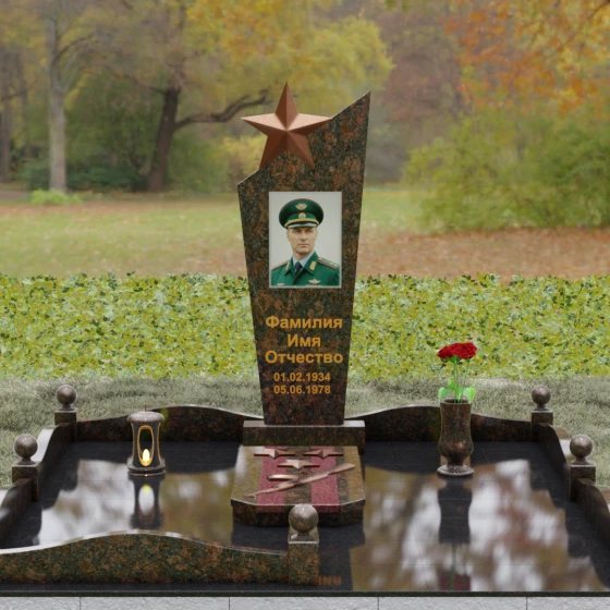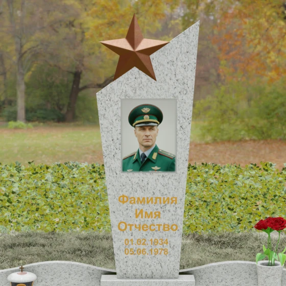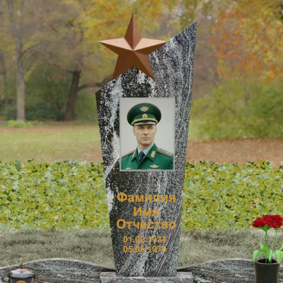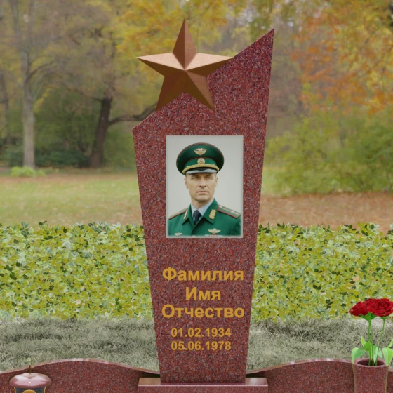 Основу композиции составляет массивное каменное полотно с уникальной асимметричной геометрией. Верхний край обелиска уходит в резкий диагональный подъем, создавая динамичный силуэт, устремленный к небесам. Венчает эту вершину объемная пятиконечная звезда — символ, выполненный в теплом бронзовом оттенке, который эффектно контрастирует с основным цветом камня. Зеркальная полировка лицевой грани доведена до эталонного блеска: поверхность буквально оживает, отражая окружающий мир и создавая глубину, в которой запечатлен портрет. Прямые, строгие линии боковых граней подчеркнуты аккуратными фасками, что придает всей конструкции архитектурную завершенность и визуальную легкость при сохранении колоссальной физической прочности.