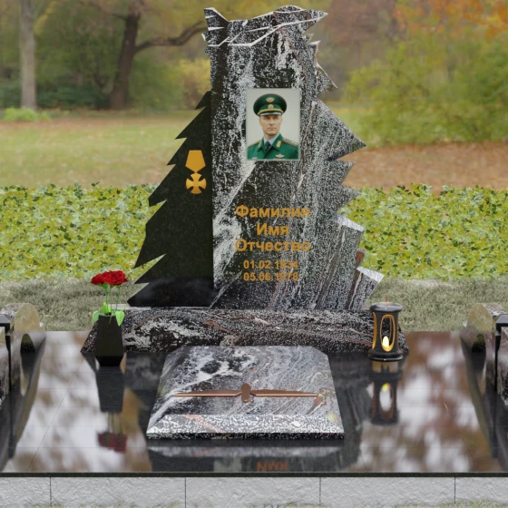 Эстетика данного мемориала строится на глубоком уважении к деталям: от золоченой гравировки ордена на резной «ветви» камня до безупречной компоновки портрета и надписей, которые гармонично вписаны в общую архитектонику стелы.