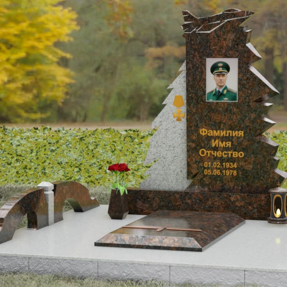 Надгробие из натурального камня (Артикул 202) — это монументальная композиция, созданная для того, чтобы увековечить память о человеке чести, чья жизнь была неразрывно связана с небом и служением отечеству. Архитектурное решение стелы поражает своей динамикой и символизмом: в верхней части монумента застыл в стремительном взлете силуэт современного истребителя, выполненный с ювелирной точностью. Левая грань памятника решена в виде резных, асимметричных выступов, напоминающих ветви северной ели или ломаные линии скалистого утеса. Такая геометрия придает мемориалу мужественный, волевой характер, подчеркивая стойкость и твердость духа ушедшего. Игра ломаных линий и острых углов создает ощущение мощи, которое невозможно передать в классических прямоугольных формах.
