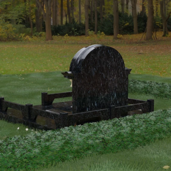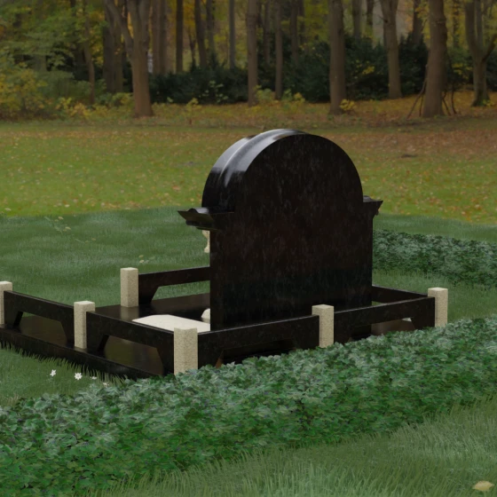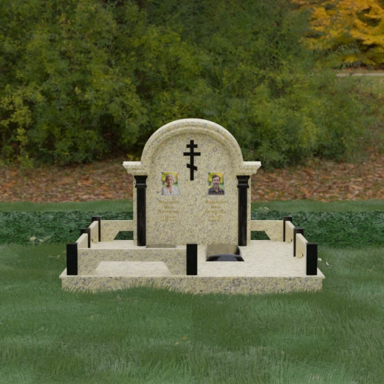 Комбинирование двух контрастных видов камня, как показано на представленных образцах, позволяет выделить ключевые детали: например, сделать светлые колонны на фоне темной стелы или выделить надгробные плиты. Широкая плоскость арки идеально подходит для размещения двух портретов — будь то гравировка или фотокерамика в медальонах. Пропорции стелы позволяют симметрично расположить памятные надписи, сохраняя визуальный баланс и эстетическую гармонию всей композиции.