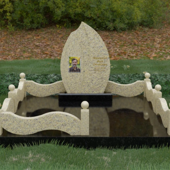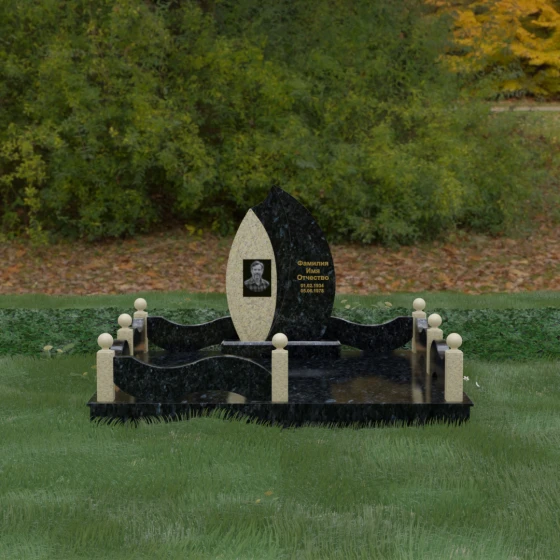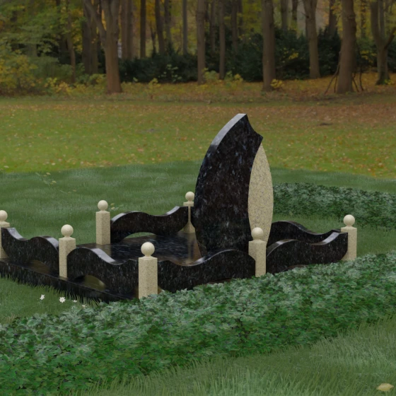 Комплексное благоустройство участка в данной модели заслуживает отдельного описания. Вместо открытого грунта мы предлагаем полную облицовку площади массивными гранитными плитами. Это не только создает завершенный, эстетически безупречный вид, но и практически избавляет от необходимости борьбы с сорняками. Периметр участка обрамляет комбинированный цоколь: темные массивные столбики с идеально отполированными навершиями в виде каменных шаров чередуются с волнообразными светлыми вставками. Эти изящные «волны» в ограждении перекликаются с формой центрального надгробия, создавая единый архитектурный ансамбль, который выглядит как монолитная и нерушимая крепость памяти.