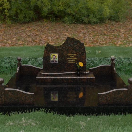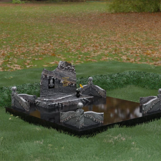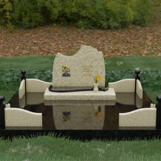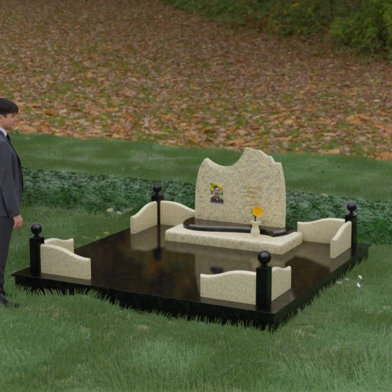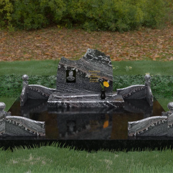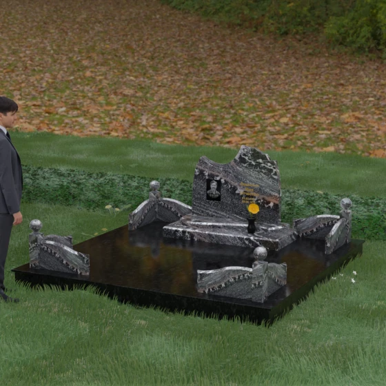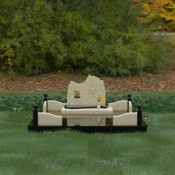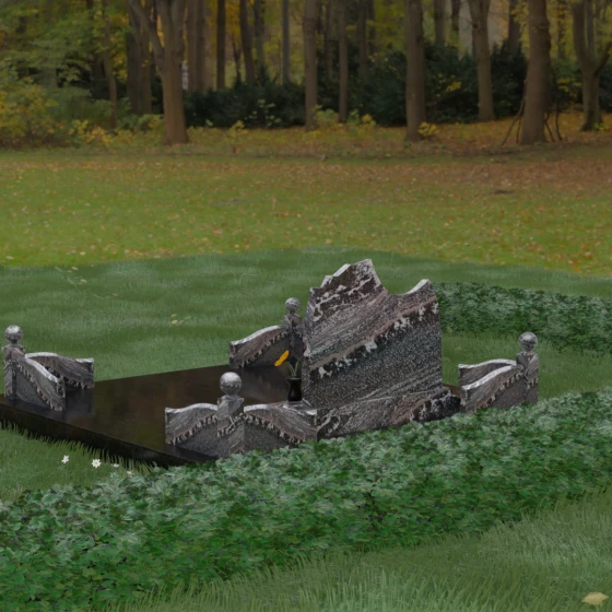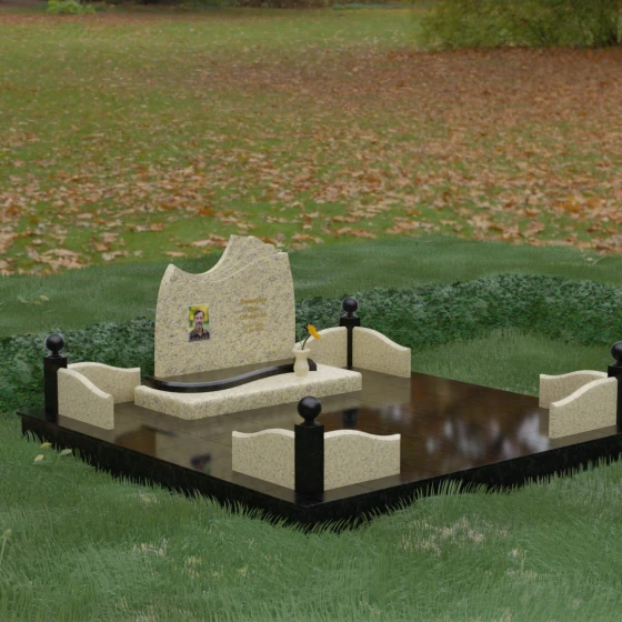 • Декоративное ограждение: По периметру установлены невысокие бордюры из светлого камня с изящными изгибами, которые перекликаются с формой основной стелы.
