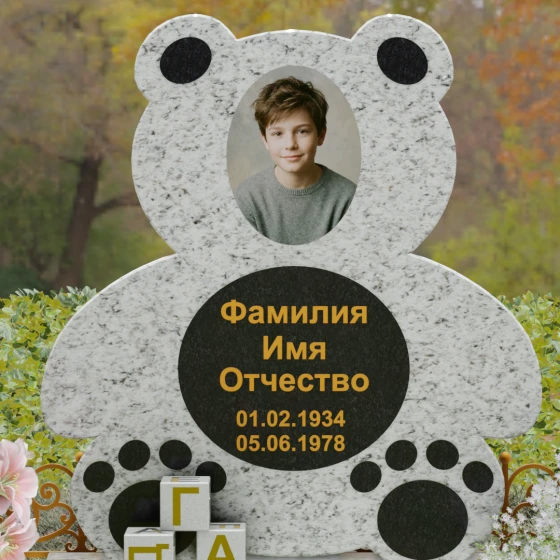 Представленное надгробие из натурального камня (Артикул 235) — это подлинное произведение мемориального искусства, в котором монументальность гранита встречается с трогательной нежностью художественного образа. Силуэт памятника выполнен в форме стилизованной фигуры медвежонка, что мгновенно переводит восприятие из плоскости строгой скорби в область светлых, чистых воспоминаний о невинности и искренности. С точки зрения искусствоведа, выбор такой формы является глубокой аллегорией вечной защиты и неувядающей любви: округлые, мягкие линии стелы лишены острых углов, что символизирует бесконечность и гармонию.
