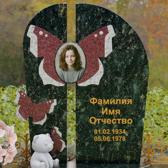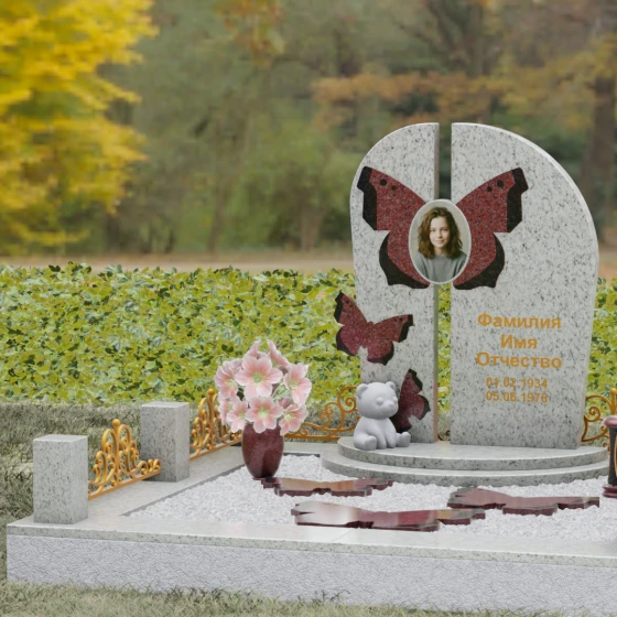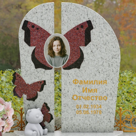 Центральным элементом ансамбля выступает величественная вертикальная стела, разделенная узким вертикальным просветом на две симметричные части. Этот архитектурный прием создает эффект воздушности и позволяет свету проникать сквозь плотную массу камня, символизируя открытость небесных врат и свободу духа. Верхушка стелы оформлена плавным полукруглым изгибом, лишенным острых углов, что дарит ощущение абсолютного умиротворения и вечного покоя. Главным художественным акцентом является мастерски выполненная инкрустация в виде расправленных крыльев бабочки, которые бережно обрамляют центральный овальный портрет. Контрастная игра фактур — зеркально-черного полированного гранита и насыщенных красных вставок с белым природным рисунком — создает поразительный визуальный объем. Изящная золоченая гравировка шрифта придает оформлению особую торжественность, отчетливо выделяясь на темном фоне камня и сохраняя читаемость на долгие десятилетия.