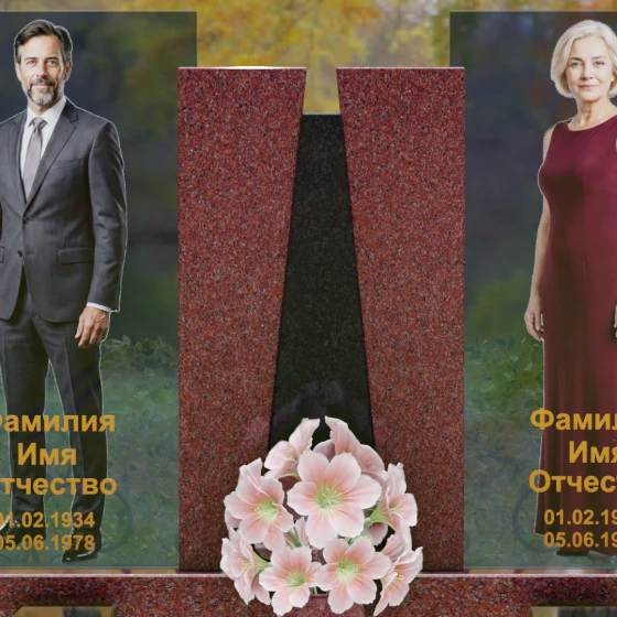 Центральным элементом ансамбля выступает трехсоставная стела, поражающая своей выверенной геометрией. В сердце композиции расположен массивный гранитный пилон, разделенный на две симметричные части клиновидной вставкой из контрастного камня. Этот «врез» создает мощный визуальный акцент, символизирующий светлую память, пробивающуюся сквозь толщу времени. По бокам от центрального монолита установлены высокотехнологичные панели из закаленного многослойного стекла. На них нанесены ростовые портреты, которые благодаря прозрачности материала кажутся объемными и живыми. Каждая грань камня проходит многоступенчатую обработку, достигая идеальной прямолинейности, что подчеркивает современный, «европейский» характер этого надгробного сооружения.
