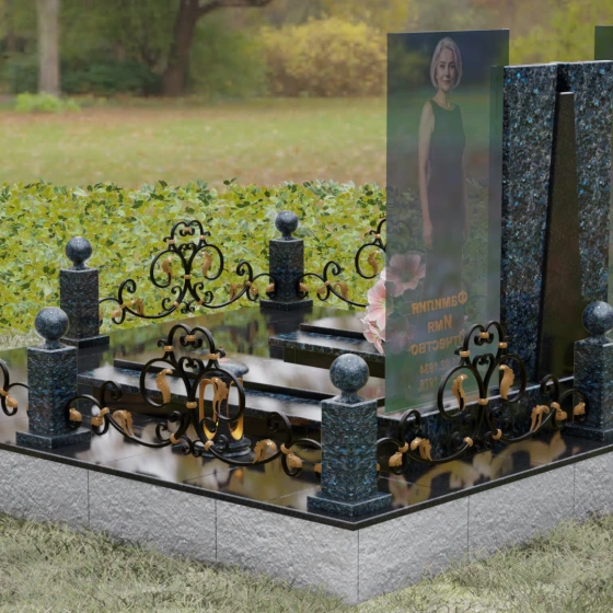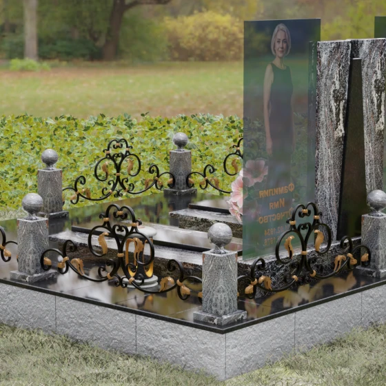 Кому подойдет: Эта монументальная композиция разработана для семейного захоронения двух человек (супругов, родителей). Она станет идеальным выбором для тех, кто ищет современное, статусное решение в стиле модерн, где классическая надежность гранита сочетается с художественной легкостью стеклянных элементов. Благодаря возможности выбора цвета камня, модель универсальна: в светлом исполнении (мрамор Тассо или Мансуровский гранит) она выглядит возвышенно и легко, а в темных тонах Габбро или Лезниковского гранита приобретает черты величественного склепа.