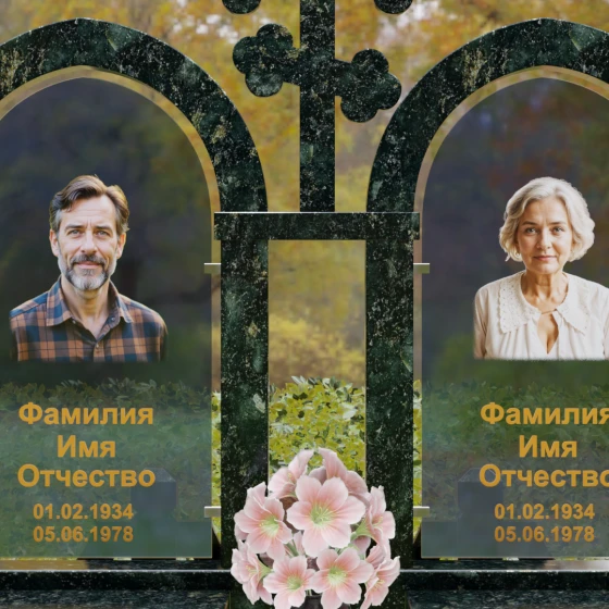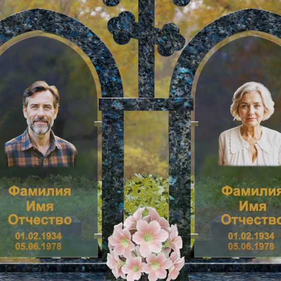 Композиционное решение модели 244 строится на строгой симметрии и вертикальной устремленности. Доминантой всего сооружения выступает центральный православный крест с четкими, лаконичными гранями, возвышающийся над основной конструкцией. Он служит духовным стержнем, объединяющим две массивные арки, которые формируют индивидуальные пространства для захоронений. Плавные изгибы арочных сводов, выполненные из темного полированного камня, создают ощущение торжественного портала, врат в вечность. Внутри этих каменных рам располагаются крупные стелы-экраны. Их поверхность идеально подготовлена для нанесения детализированных портретов и эпитафий, создавая визуальный контраст с более темным и глубоким тоном обрамления.