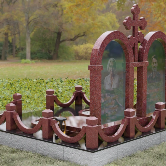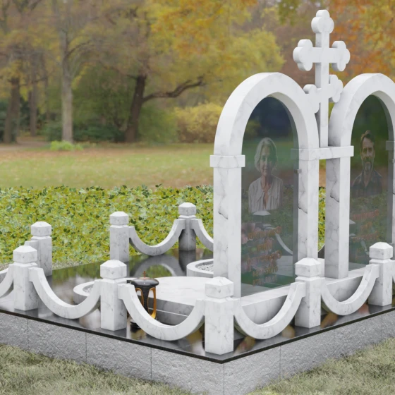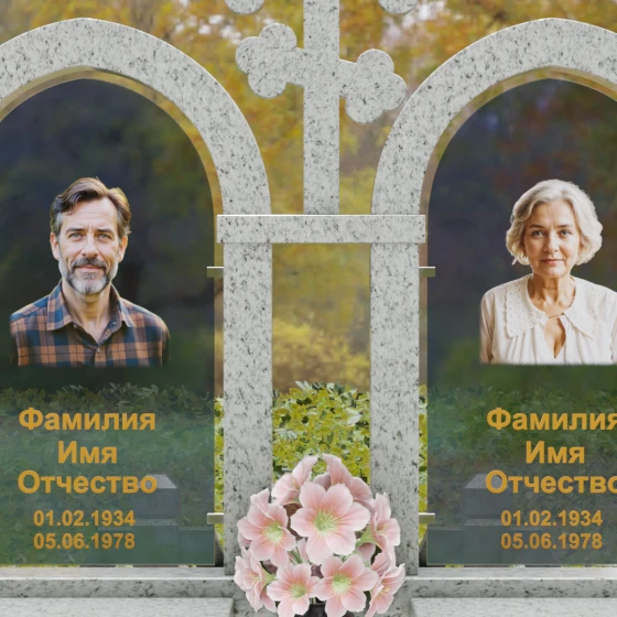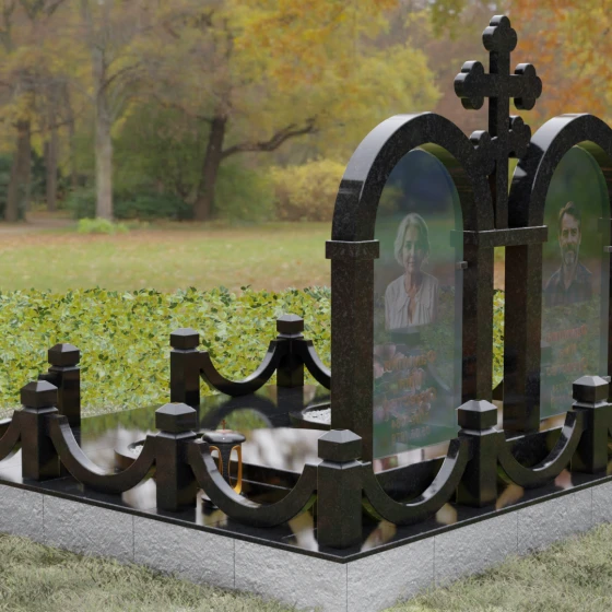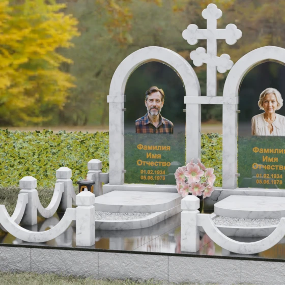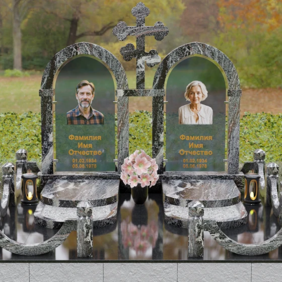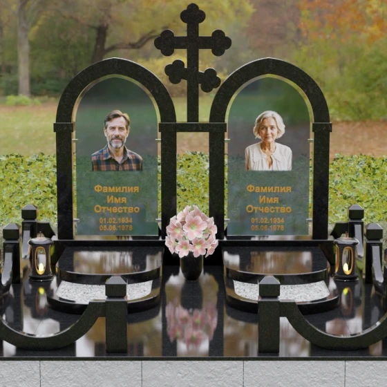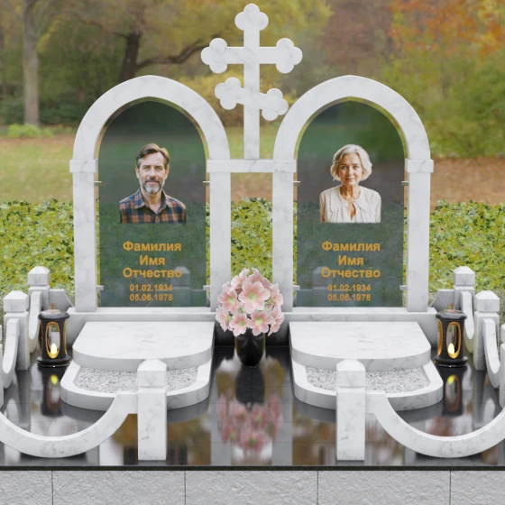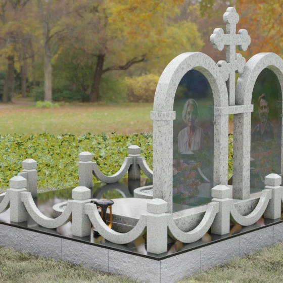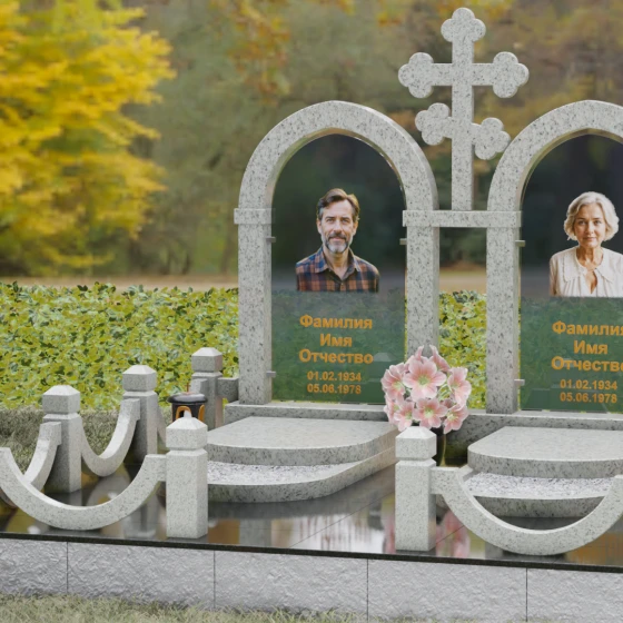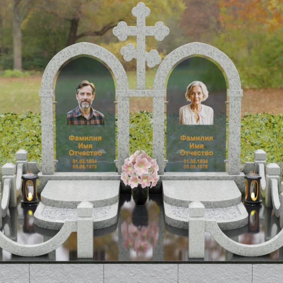 Кому подойдет: Данная модель разработана специально для семейного захоронения. Двойная арочная структура идеально подходит для увековечивания памяти родителей, супругов или братьев и сестер, объединяя их в одном сакральном пространстве, но сохраняя индивидуальность каждого. Выраженный православный крест делает этот комплекс предпочтительным выбором для верующих семей. Масштаб и архитектурная сложность исполнения подчеркивают высокий статус и глубокое уважение к усопшим, делая этот ансамбль заметным и значимым объектом на территории некрополя.