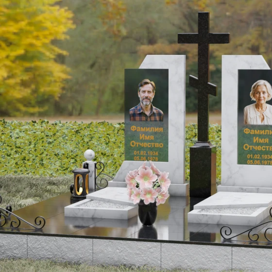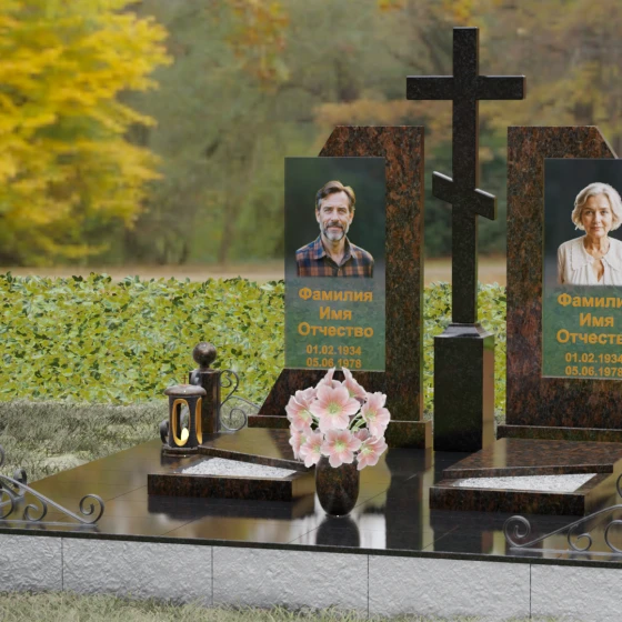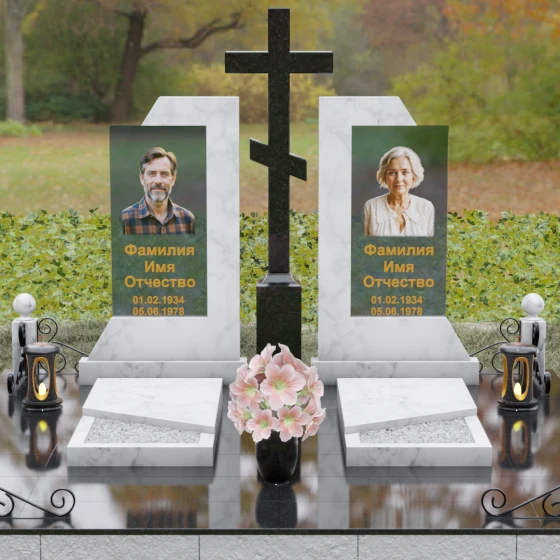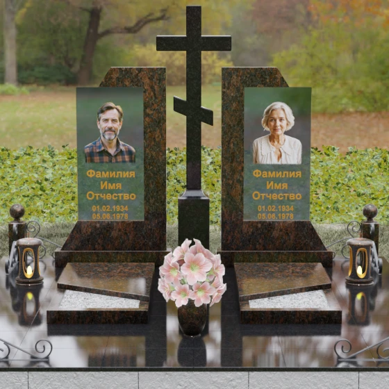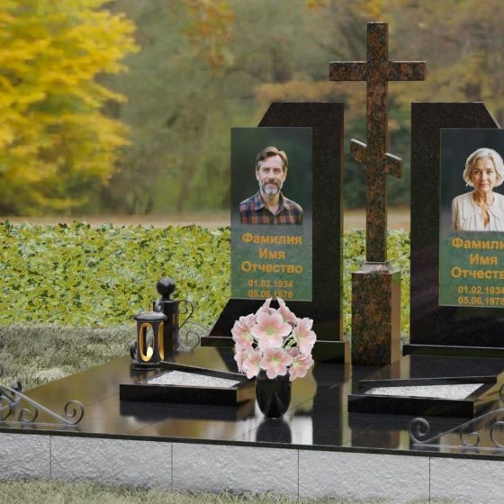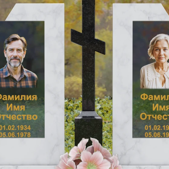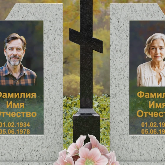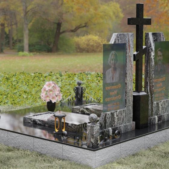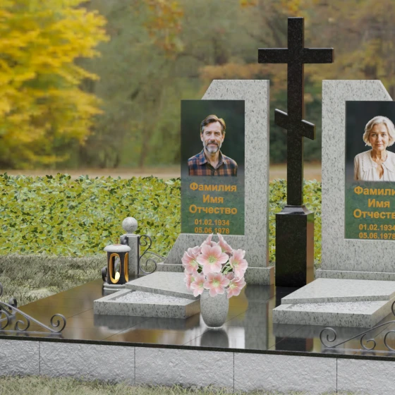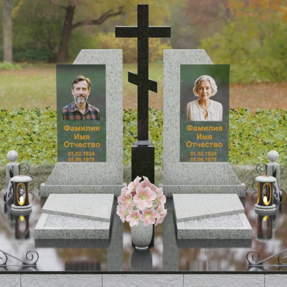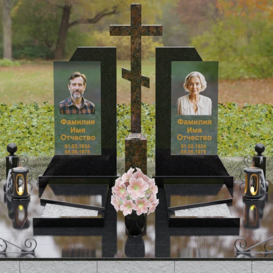 Каждая деталь этой модели пронизана глубокой символикой. Две парные колонны олицетворяют неразрывную связь душ, единство жизненного пути и взаимную поддержку, которая продолжается даже за гранью земного бытия. Центральный крест здесь выступает не только как конфессиональный маркер, но и как «Древо Жизни», защищающее и объединяющее близких под своей сенью. Сочетание тяжелого, незыблемого камня и прозрачного, почти эфирного стекла символизирует встречу материального и духовного миров. Этот гранитный монумент внушает чувство защищенности и нерушимости памяти, которая не подвластна тлену.