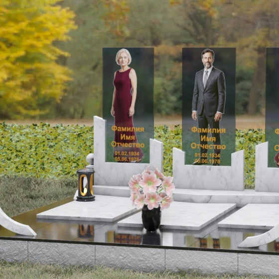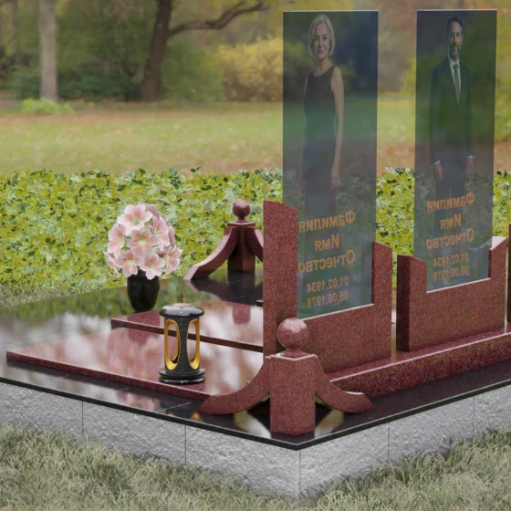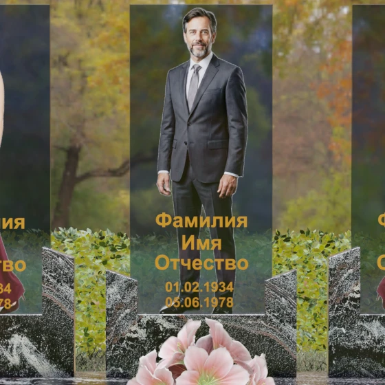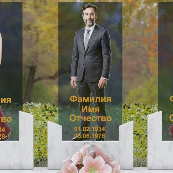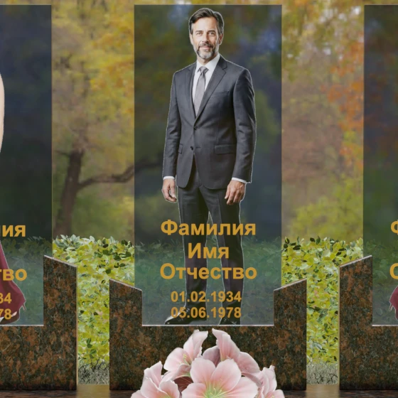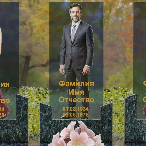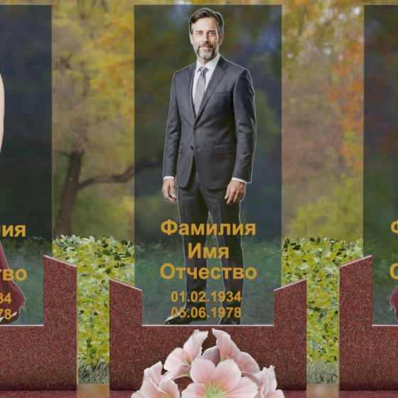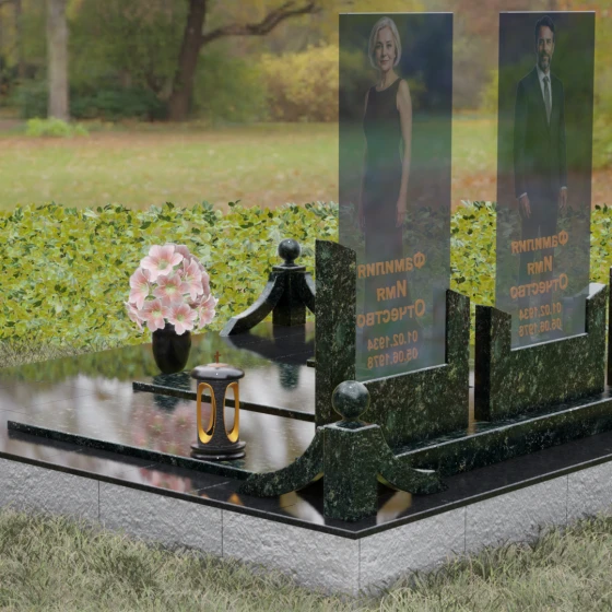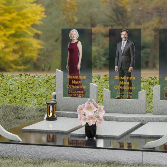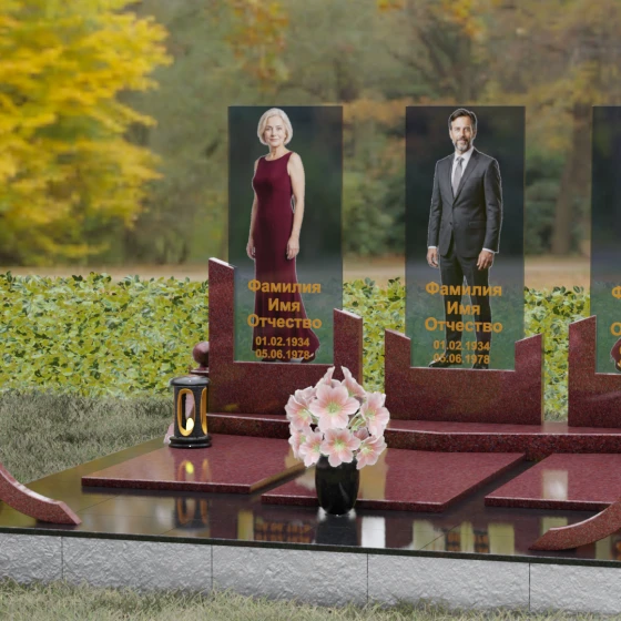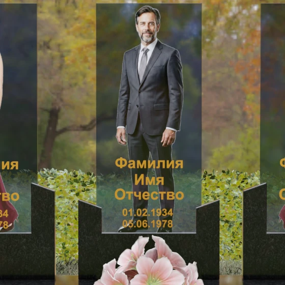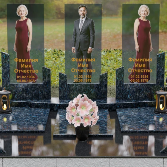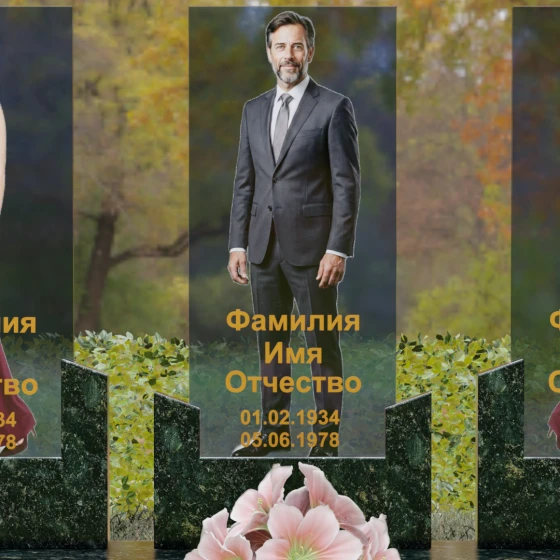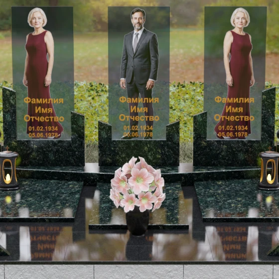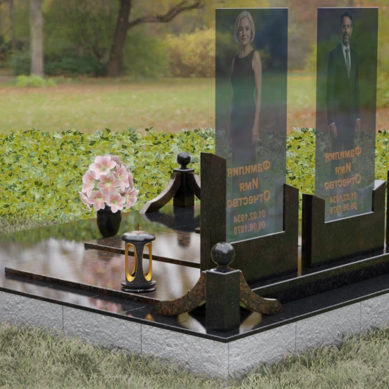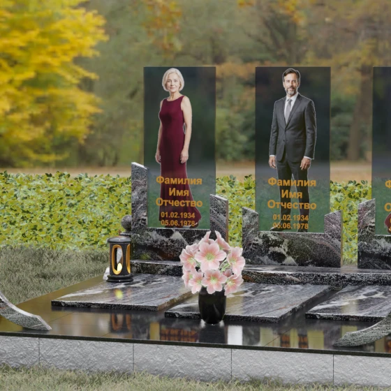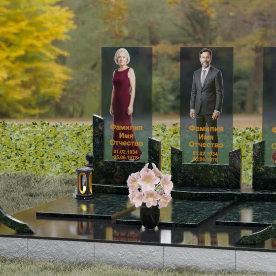 Оформление: Для стел такой формы идеальным решением станет классическая глубокая гравировка с покрытием сусальным золотом. Высокие вертикальные плоскости позволяют расположить портреты в полный рост или крупные погрудные изображения, сохраняя при этом достаточно места для эпитафий и декоративных символов. Золочение букв будет эффектно контрастировать с темными видами гранита, подчеркивая статус и торжественность мемориала.
