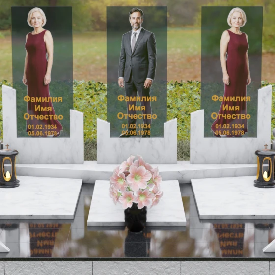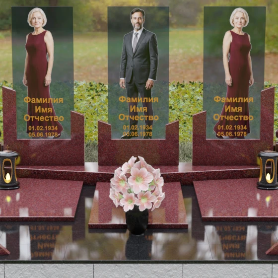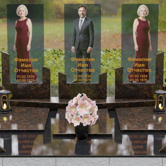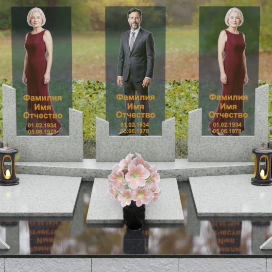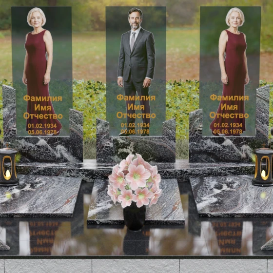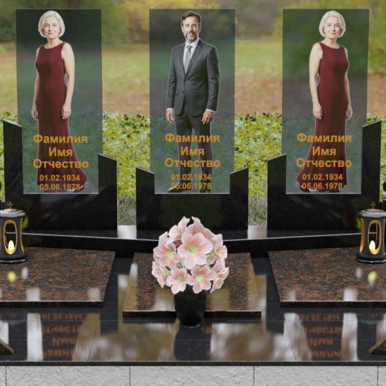 Представленный монумент (Артикул 247) — это не просто памятный знак, а величественный архитектурный ансамбль, воплощающий идею неразрывной семейной связи, уходящей в вечность. Данное надгробие из натурального камня спроектировано как триптих: три вертикальные стелы объединены общим массивным основанием, что символизирует единство душ и преемственность поколений. Центральная часть композиции акцентирована монументальностью, в то время как боковые элементы создают гармоничный визуальный баланс. Геометрия изделия строгая и лаконичная: идеально ровные грани подчеркнуты благородной широкой фаской, которая придает камню объем и дополнительную игру света на срезах. Особое внимание стоит уделить художественной резьбе у подножия — объемные лепестки лилий, высеченные в камне, кажутся живыми благодаря тонкой проработке деталей и мягкому матовому финишу, контрастирующему с зеркальной поверхностью основных плит.