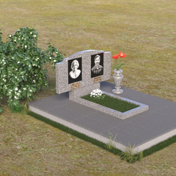 Этот гранитный монумент представляет собой композицию, где каждая деталь продумана до мелочей. Верхняя часть памятника имеет фигурную форму с плавными, волнообразными очертаниями, словно застывшая мелодия скорби. Верхний край обработан таким образом, что создает впечатление легкой, воздушной драпировки. Боковые грани аккуратно скруглены, смягчая строгость камня и придавая ему более изящный вид. Фаски, снятые по периметру, подчеркивают контур и добавляют выразительности. Лицевая поверхность отполирована до зеркального блеска, отражая свет и создавая ощущение глубины. На полированной поверхности выгравированы портреты усопших и памятные надписи, выполненные с особой тщательностью и вниманием к деталям. Под основной плитой располагается горизонтальная плита, также выполненная из черного гранита, создающая дополнительный уровень и подчеркивающая монументальность композиции. На ней размещена еще одна полированная плита, но уже меньшего размера, как символ нерушимости и продолжения рода.