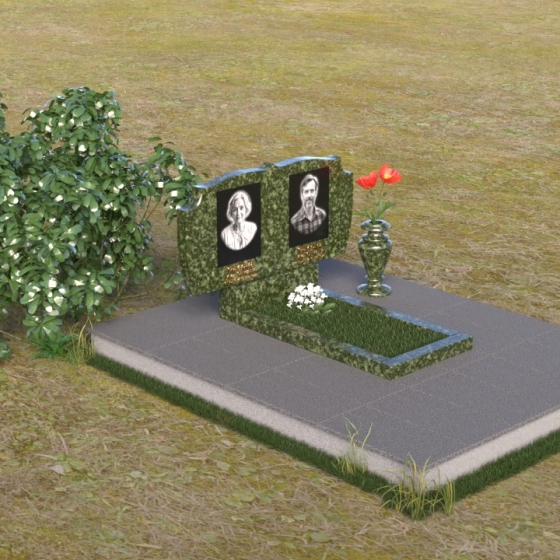 Композиция монумента строится на контрасте плавных линий и строгих геометрических форм. Верхняя часть, несущая на себе портреты усопших, имеет форму, напоминающую раскрытую книгу или свиток, где каждая страница хранит историю жизни. Края этого "свитка" искусно обработаны: верхняя грань словно оплавлена временем, приобретая мягкие, неровные очертания, а боковые стороны имеют более четкий, но все же сглаженный профиль. Фаска, идущая по периметру, придает верхней части визуальную легкость, отделяя ее от основания. Нижняя часть представляет собой прямоугольную плиту с зеркальной полировкой, отражающей небо и окружающий мир, создавая эффект бесконечности и связи с ушедшим. Она словно портал, соединяющий мир живых и мир мертвых, напоминая о непрерывности бытия. Боковины плиты имеют четкую геометрию, подчеркивая основательность и незыблемость памяти.