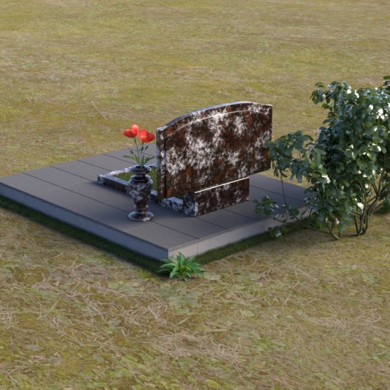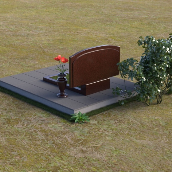 В нижней части стелы располагается прямоугольная вставка, также выполненная в полированном черном граните, что создает визуальный контраст и добавляет монументальности. Перед стелой установлена горизонтальная плита, повторяющая форму верхней части стелы, что придает композиции завершенность и гармонию. Рядом с памятником располагается ваза из черного гранита, в которой можно разместить живые цветы, символизирующие вечную память и любовь.