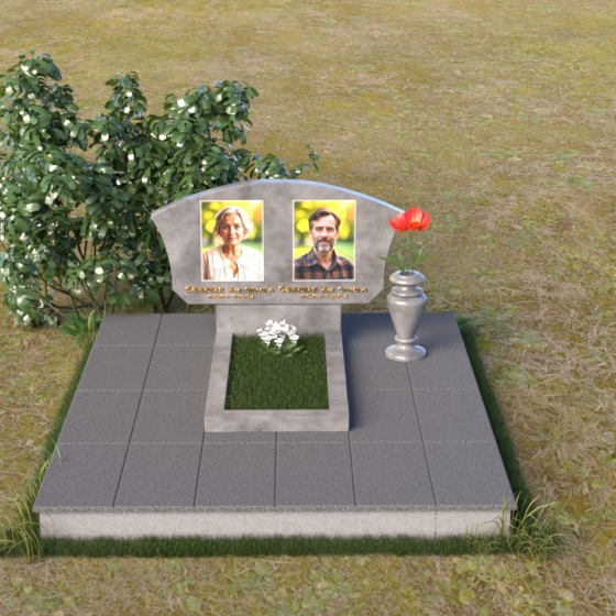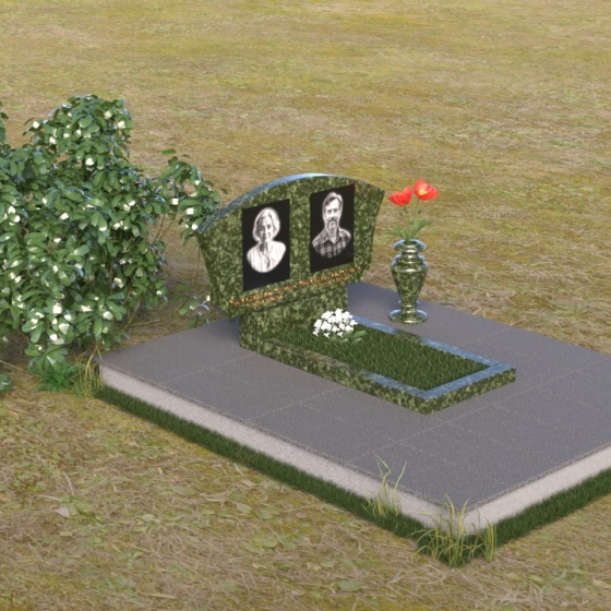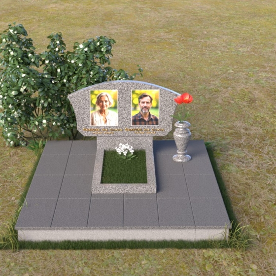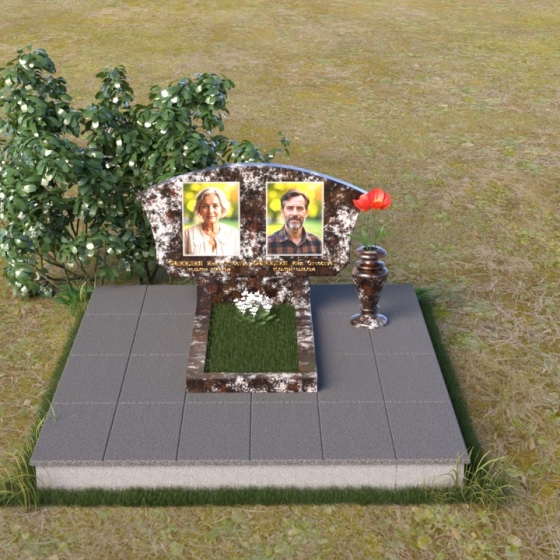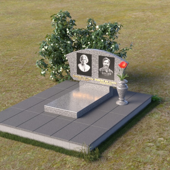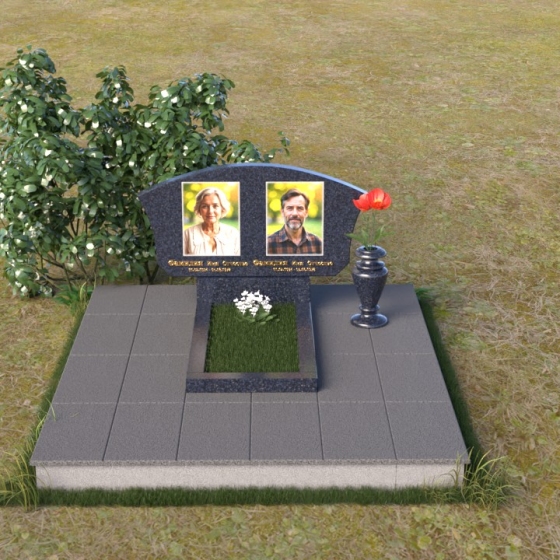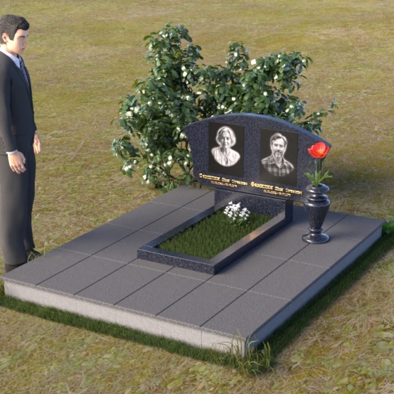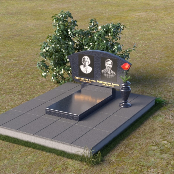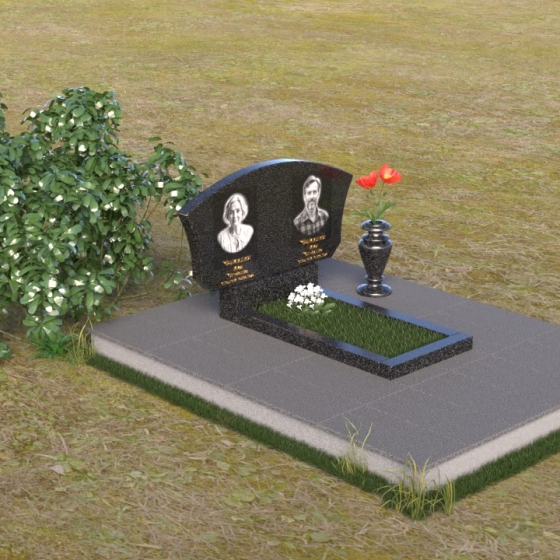 Мемориальная композиция ПГ118 представляет собой лаконичную, но выразительную конструкцию, где доминирует строгая геометрия, смягченная плавными линиями. Стела имеет форму прямоугольника с аккуратно закругленной верхней частью, создающей ощущение завершенности и гармонии. Боковые грани стелы слегка скошены, что придает ей дополнительный объем и динамичность. Фаски, снятые по периметру лицевой стороны, подчеркивают четкость контуров и усиливают игру света и тени, особенно заметную на полированной поверхности черного гранита. Подставка под стелу, выполненная в форме прямоугольной плиты, служит надежным основанием и визуально уравновешивает всю композицию. Дополнительная горизонтальная плита перед стелой создает пространство для цветов и памятных вещей, а также является связующим элементом между стелой и окружающей средой. На стеле расположены портреты усопших, выполненные с высоким уровнем детализации, что позволяет сохранить их облик в памяти потомков. Рядом с портретами размещены надписи, выполненные золотым шрифтом, придающим композиции торжественность и благородство.