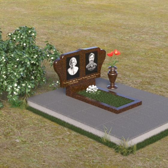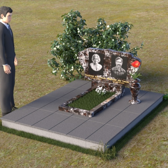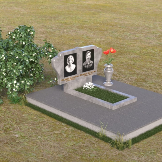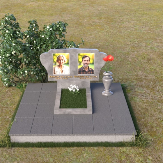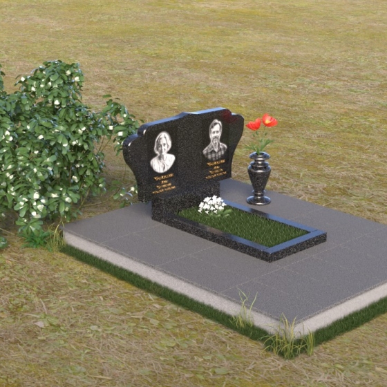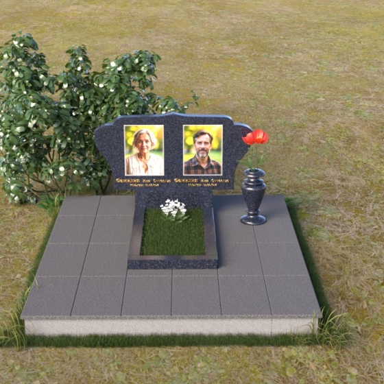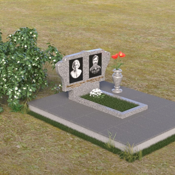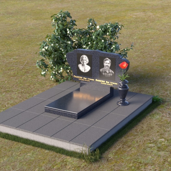 Величественная стела памятника ПГ131 воплощает в себе сдержанную элегантность и утонченность. Верхняя часть памятника имеет плавные, волнообразные очертания, создающие ощущение легкости и воздушности. Верхняя кромка искусно обработана, представляя собой чередование мягких выпуклостей и вогнутостей, что придает монументу неповторимый художественный облик. Боковые грани стелы деликатно скошены, образуя изящные фаски, которые подчеркивают четкость линий и геометрию формы. Нижняя часть стелы переходит в прямоугольное основание, создавая прочную и надежную опору. На лицевой стороне стелы размещены два портрета, выполненные с высокой степенью детализации. Завершает композицию небольшая тумба с зеркально отполированной поверхностью, на которой можно разместить цветы или свечи.