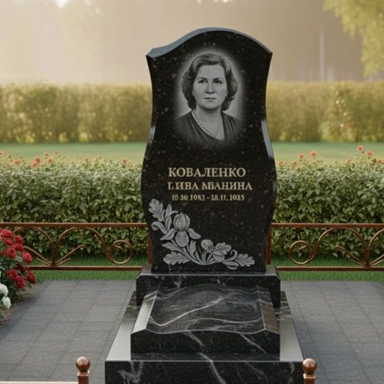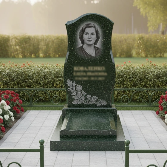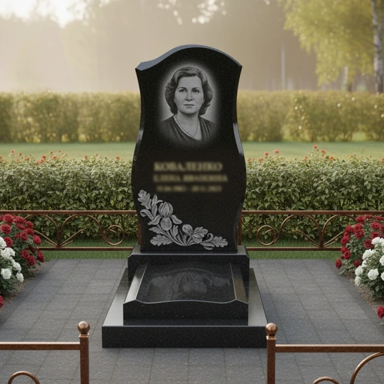- Стела: Изящная, плавно изогнутая стела с круговой полировкой и акцентированными фасками, придающими ей объем и выразительность. Декоративный цветочный орнамент в нижней части стелы добавляет композиции нежности и трогательности.