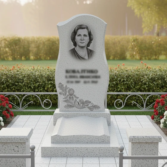 - Надгробная плита: Монолитная конструкция закрытого типа с фигурными элементами, повторяющими плавные линии стелы, обеспечивает гармоничное завершение всего комплекса.