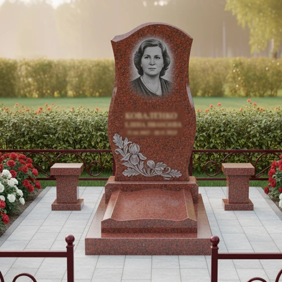 Памятник спроектирован с учетом практичности и долговечности. Плавные формы и отсутствие острых углов предотвращают скопление пыли и грязи, облегчая уход за местом захоронения. Закрытая плита исключает рост сорняков, сохраняя аккуратный и ухоженный вид на долгие годы. Для оформления надписи на стеле рекомендуется использовать глубокий пескоструй с последующим покрытием сусальным золотом, что подчеркнет изысканность и долговечность памятника. Также можно дополнить композицию гранитными вазами и лампадами, которые придадут мемориалу завершенный вид.