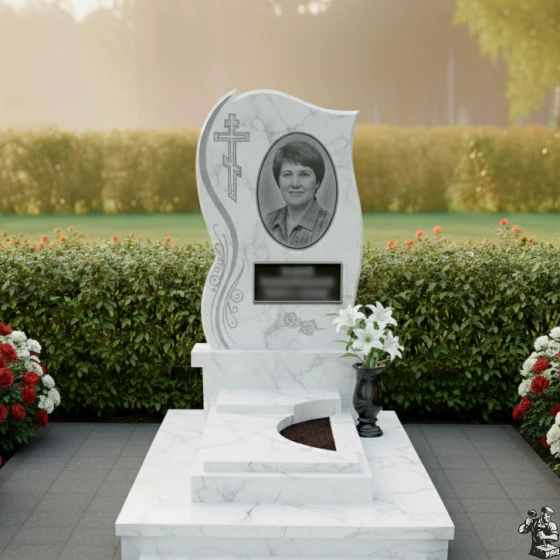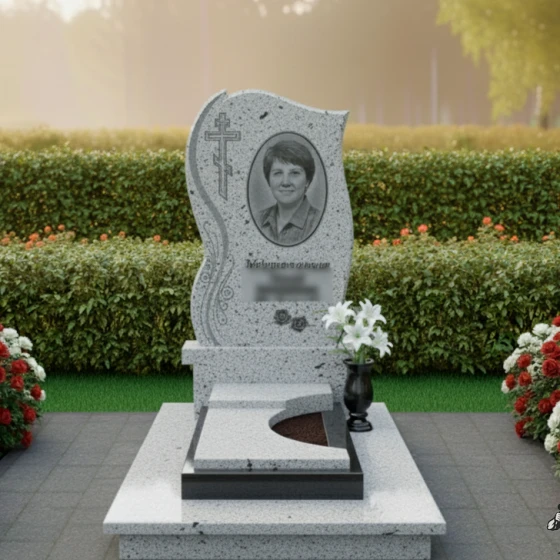 - Стела: Изогнутая форма с полированными краями и декоративными элементами в виде растительного орнамента, добавляющими изящество. В верхней части стелы расположен православный крест.