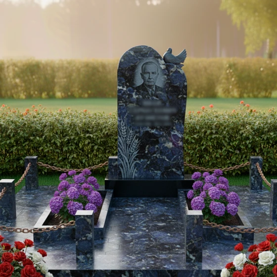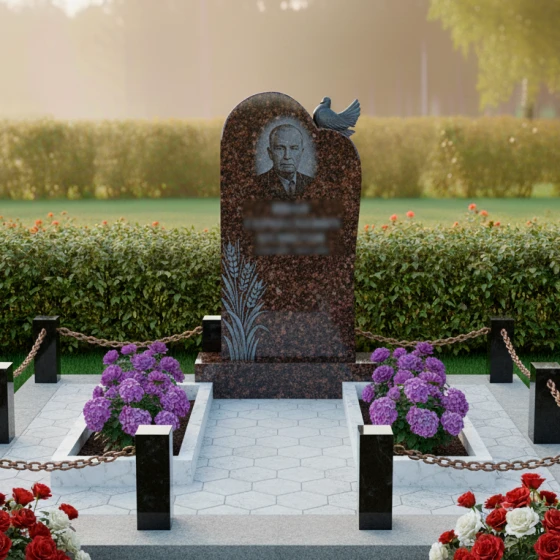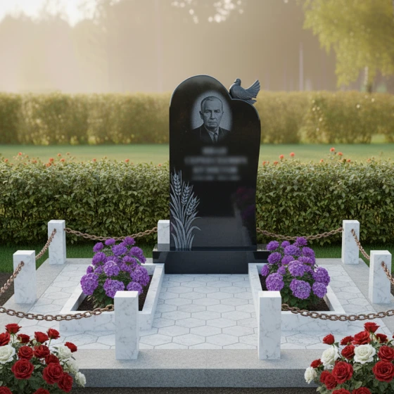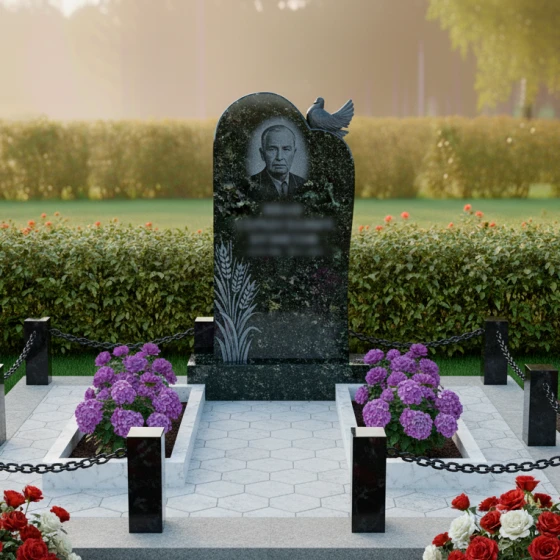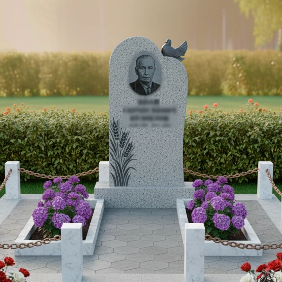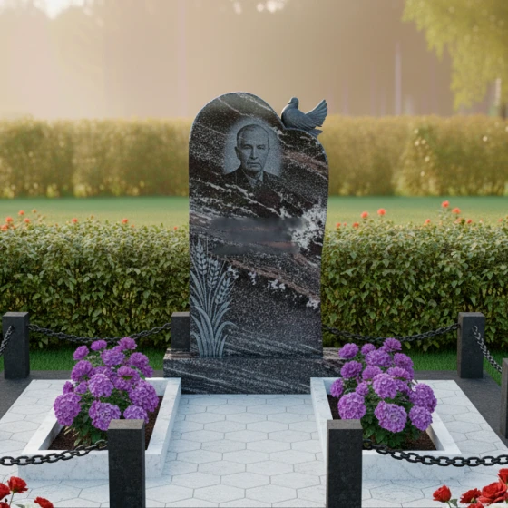 - Стела: Изящная, плавно изогнутая стела с круговой полировкой, создающая ощущение легкости и воздушности. Верх стелы украшен рельефной скульптурой голубя, символизирующего душу, устремленную в небеса.