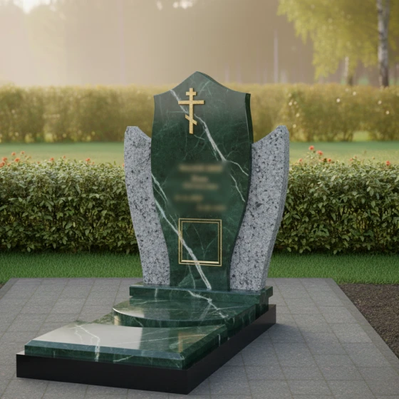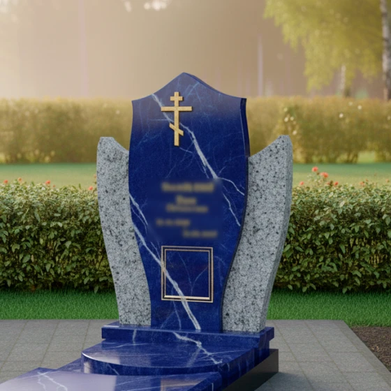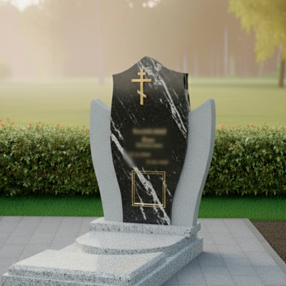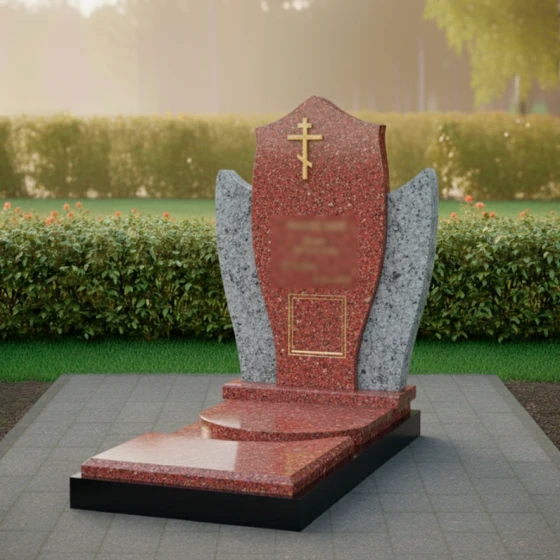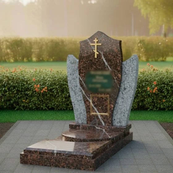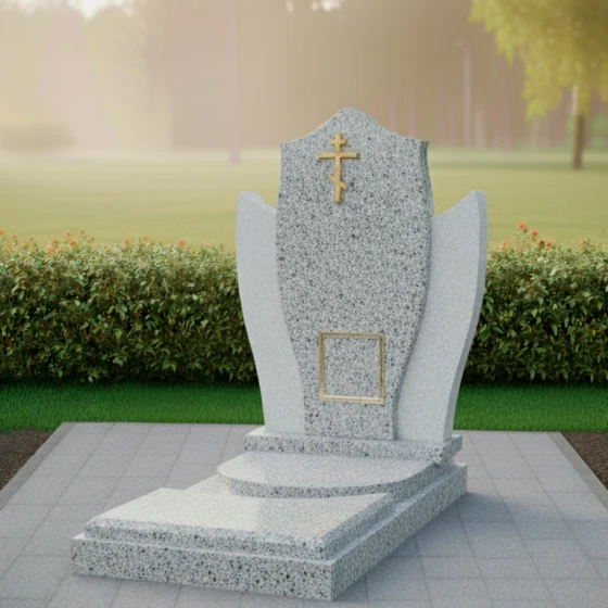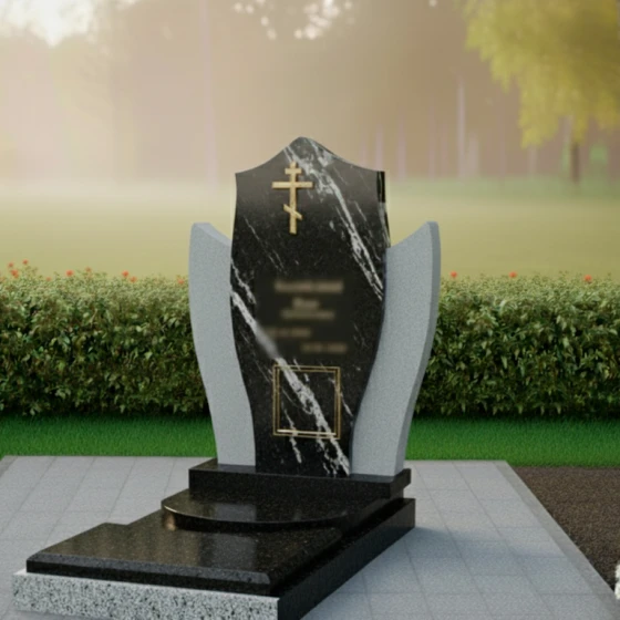 Этот памятник представляет собой выразительную композицию, где центральная стела, словно небесный покров, укрывает память об ушедшем. Мягкие, обтекаемые формы боковых элементов создают ощущение умиротворения и защиты, обрамляя стелу и подчеркивая ее значимость. Модель доступна в восьми вариантах исполнения, включая семь видов гранита и благородный мрамор Тассос, что позволяет создать уникальный образ, отражающий индивидуальность и вероисповедание покойного. Наличие православного креста указывает на принадлежность к христианской вере, делая этот мемориал особенно подходящим для православных семей.