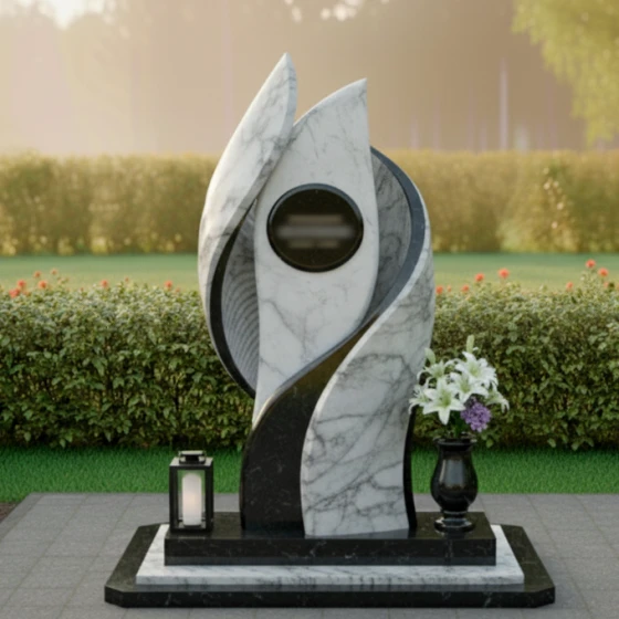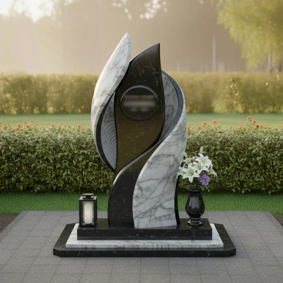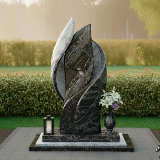 Полированная поверхность камня играет с солнечным светом, создавая мягкие блики и тени, подчеркивающие глубину и выразительность форм. Контраст темного и светлого камня усиливает визуальный эффект, делая памятник заметным и запоминающимся. Светлые элементы, выполненные из мрамора, символизируют чистоту и светлую память, а темные гранитные вставки- стойкость и вечность.