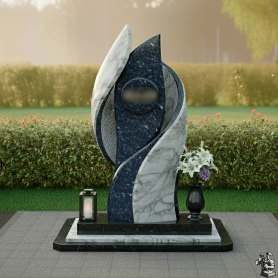 • Стела: Состоит из двух симметричных элементов, выполненных из разных видов камня, плавно переходящих друг в друга.
