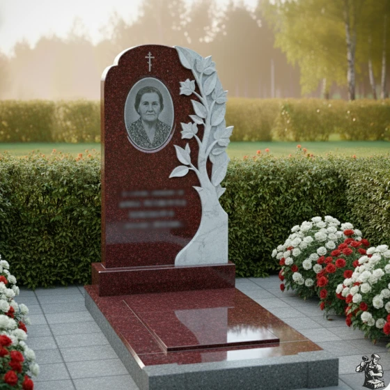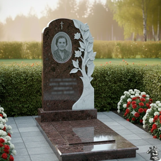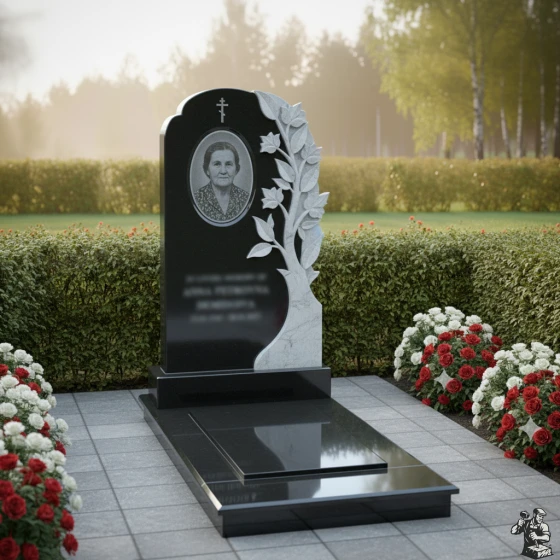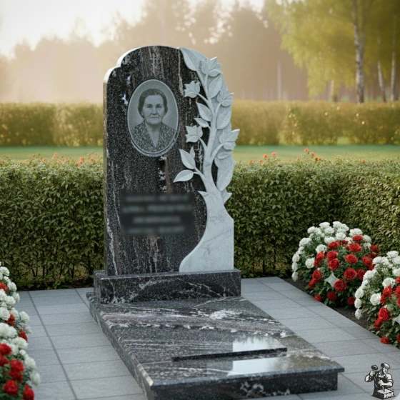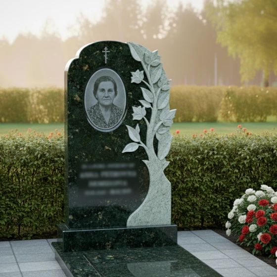 - Стела: Вертикальная плита с овальным завершением и плавным переходом к резному элементу "Древо Жизни". Круговая полировка придает камню зеркальный блеск.