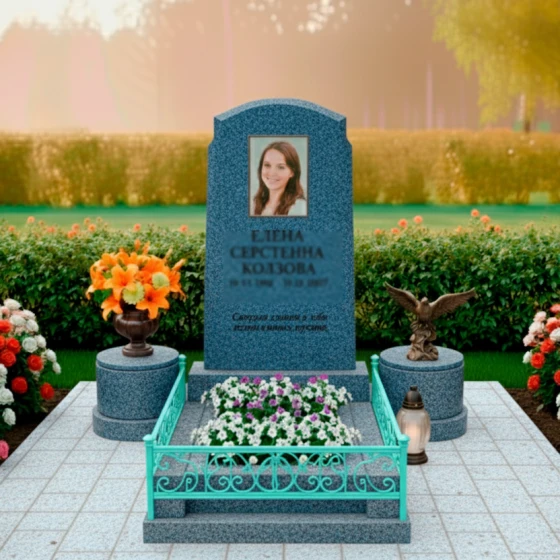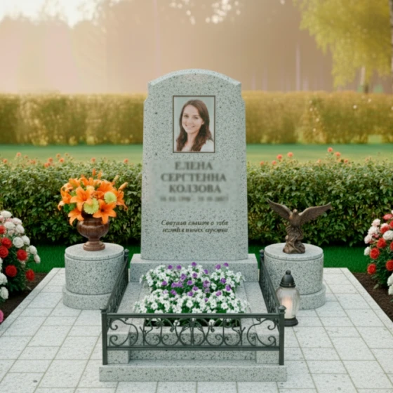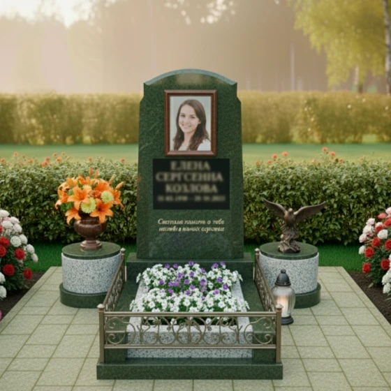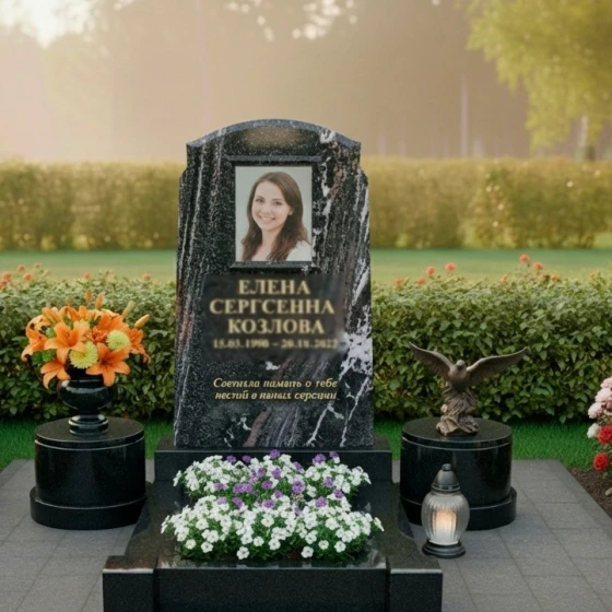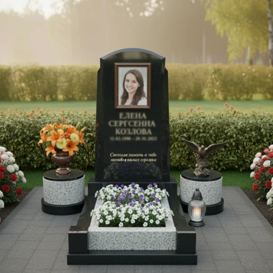 Композицию дополняют два изящных гранитных постамента по бокам от стелы. Они выполнены из светлого гранита с характерной мелкозернистой текстурой, что создает приятный контраст с черной полировкой основной стелы и цоколя. На одном из постаментов установлена элегантная гранитная ваза, наполненная яркими цветами, а на другом – бронзовая скульптура орла, символизирующая величие духа и свободу. Между постаментами, перед стелой, расположена прямоугольная цветочница, также выполненная из черного полированного гранита, что позволяет высаживать живые цветы, привнося нотку жизни и нежности в гранитную строгость.